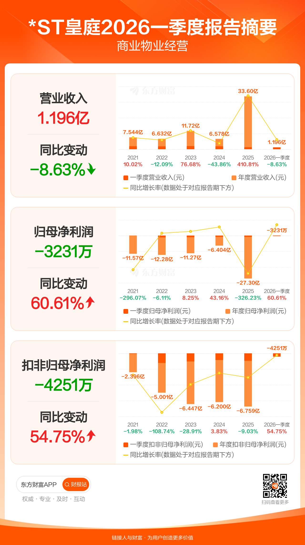 *ST皇庭4月29日发布2026年一季报显示,公司一季度实现营业收入1.20亿元,同比下滑8.63%;归母净利润-3231.10万元;扣非归母净利润-4251.32万元。