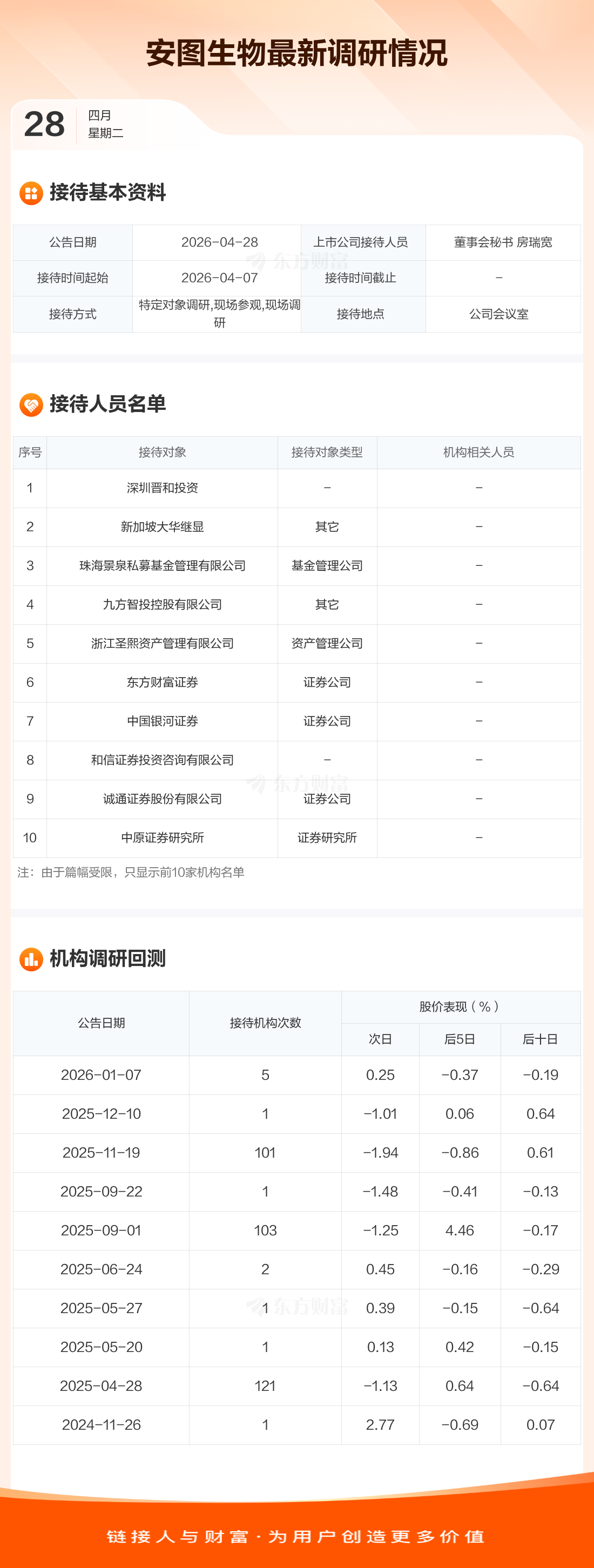 安图生物4月28日公告称,4月7日接待深圳晋和投资等13家机构调研。接待人员包括董事会秘书 房瑞宽。