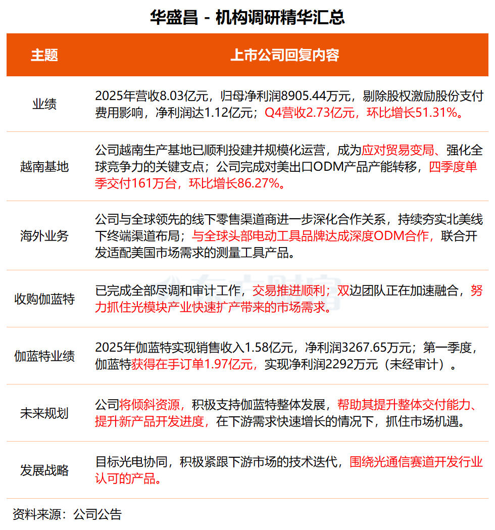 在调研中,华盛昌表示,公司对于伽蓝特整个团队非常认可,双边团队正在加速融合,努力抓住光模块产业快速扩产带来的市场需求。“公司将倾斜资源,积极支持伽蓝特的整体发展,帮助其提升整体交付能力、提升新产品开发进度,保障公司在面对下游需求快速增长的情况下,抓住市场机遇。”