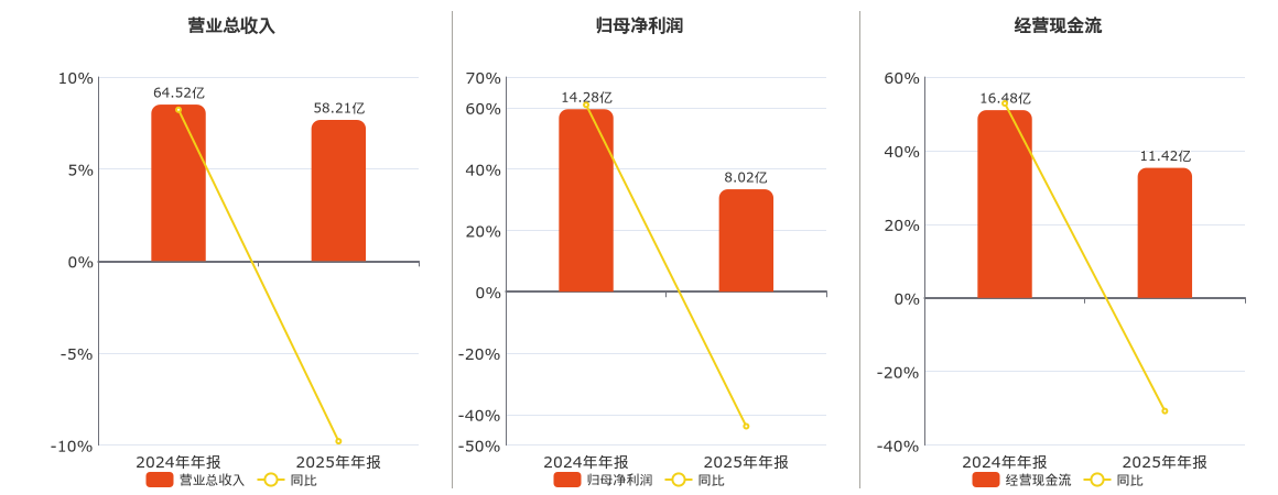 公司营业总收入为58.21亿元,较去年同报告期营业总收入减少6.32亿元,同比较去年同期下降9.79%。归母净利润为8.02亿元,较去年同报告期归母净利润减少6.26亿元,同比较去年同期下降43.86%。经营活动现金净流入为11.42亿元,较去年同报告期经营活动现金净流入减少5.07亿元,同比较去年同期下降30.74%。