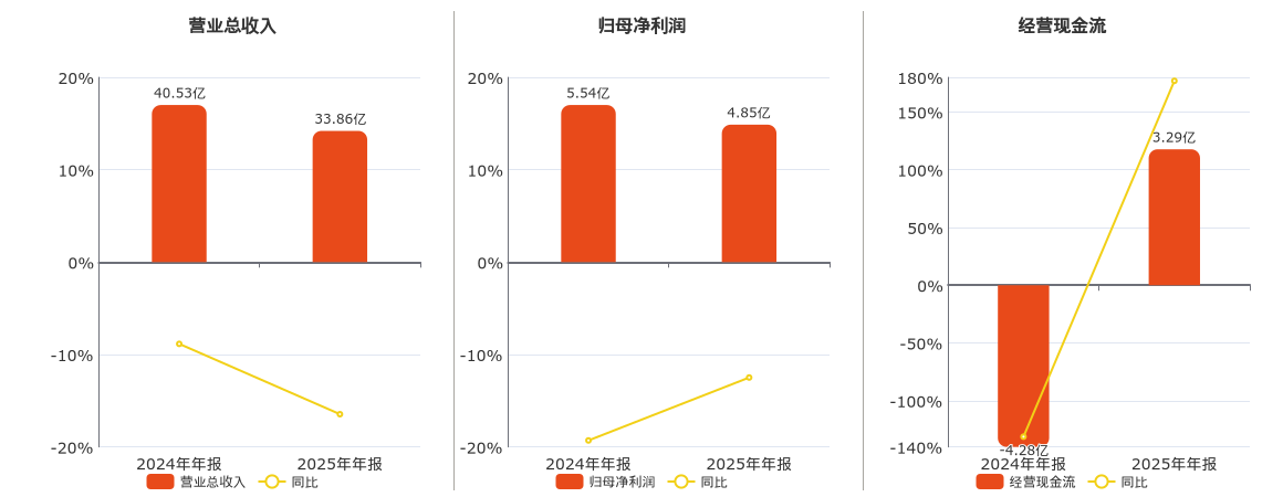公司营业总收入为33.86亿元,较去年同报告期营业总收入减少6.67亿元,同比较去年同期下降16.46%。归母净利润为4.85亿元,较去年同报告期归母净利润减少6924.60万元,同比较去年同期下降12.49%。经营活动现金净流入为3.29亿元。