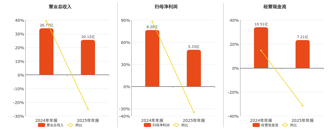公司营业总收入为20.12亿元,较去年同报告期营业总收入减少6.66亿元,同比较去年同期下降24.86%。归母净利润为5.33亿元,较去年同报告期归母净利润减少2.87亿元,同比较去年同期下降35.04%。经营活动现金净流入为7.21亿元,较去年同报告期经营活动现金净流入减少3.30亿元,同比较去年同期下降31.38%。