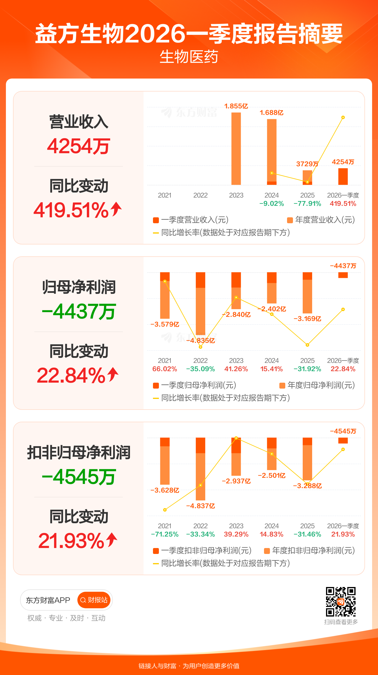 益方生物4月29日发布2026年一季报显示,公司一季度实现营业收入4254.24万元,同比增长419.51%;归母净利润-4436.72万元;扣非归母净利润-4545.15万元。