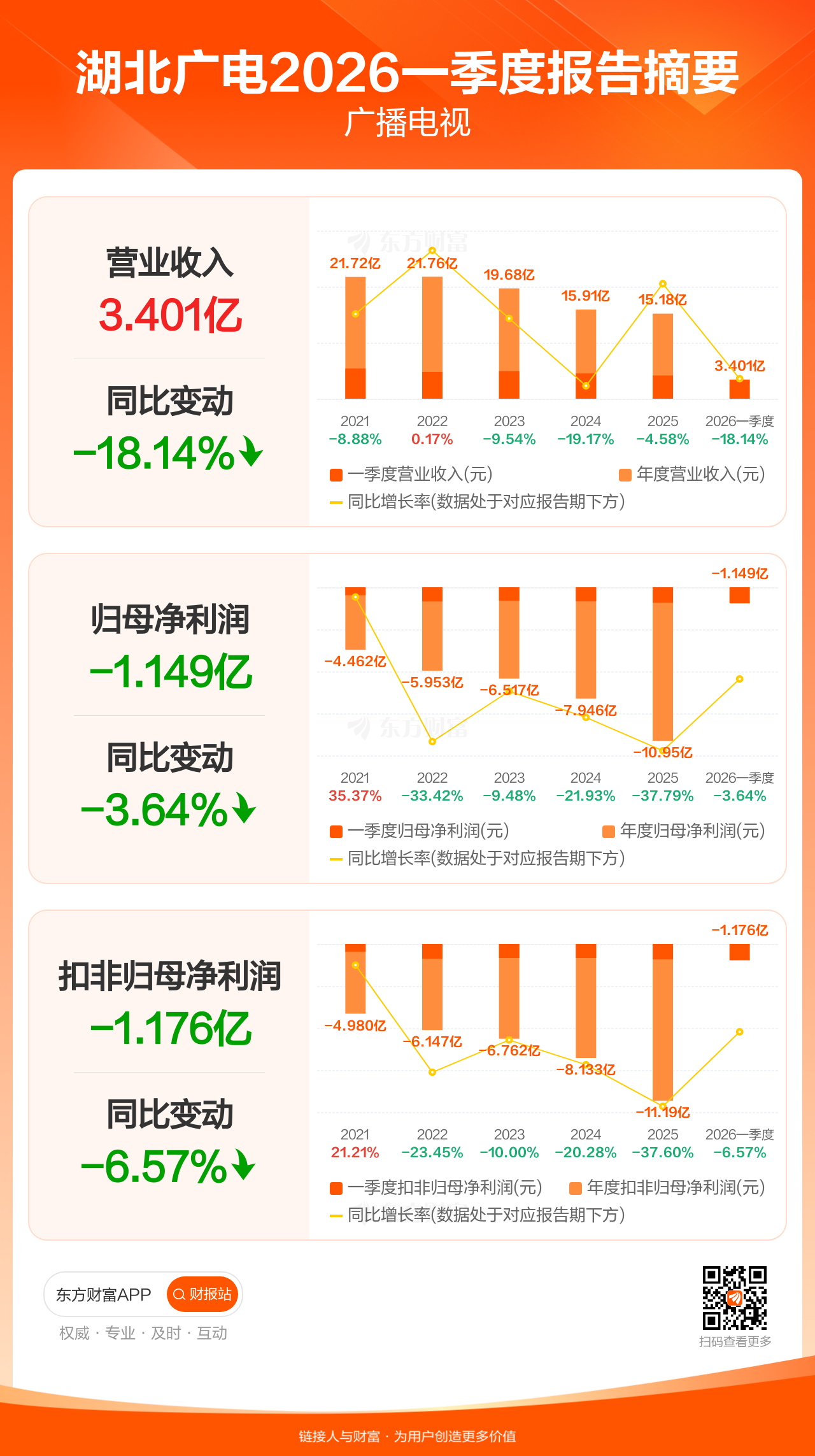 湖北广电4月29日发布2026年一季报显示,公司一季度实现营业收入3.40亿元,同比下滑18.14%;归母净利润-1.15亿元;扣非归母净利润-1.18亿元。