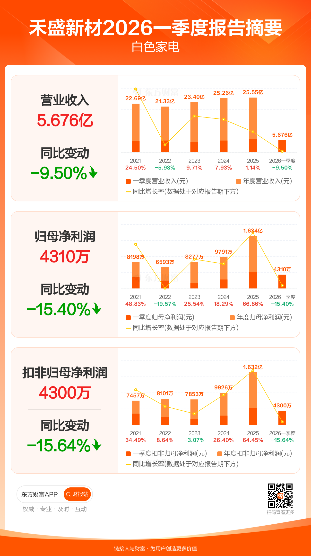 禾盛新材4月29日发布2026年一季报显示,公司一季度实现营业收入5.68亿元,同比下滑9.50%;归母净利润4310.44万元,同比下滑15.40%;扣非归母净利润4299.58万元,同比下滑15.64%。