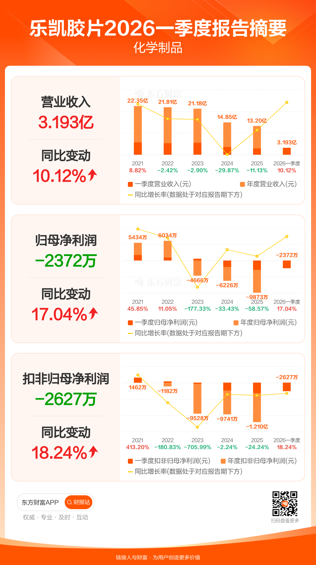 乐凯胶片4月29日发布2026年一季报显示,公司一季度实现营业收入3.19亿元,同比增长10.12%;归母净利润-2372.26万元;扣非归母净利润-2626.90万元。