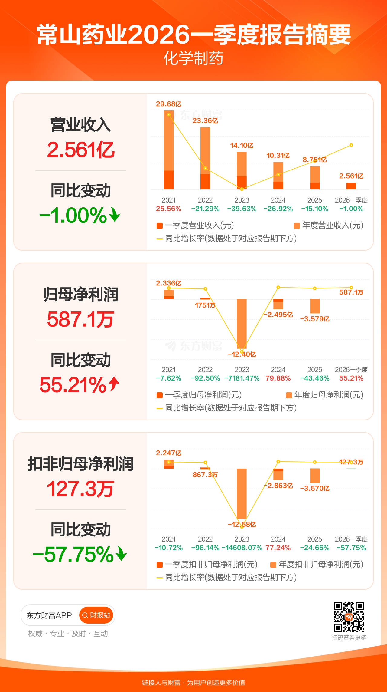 常山药业4月29日发布2026年一季报显示,公司一季度实现营业收入2.56亿元,同比下滑1.00%;归母净利润587.10万元,同比增长55.21%;扣非归母净利润127.25万元,同比下滑57.75%。