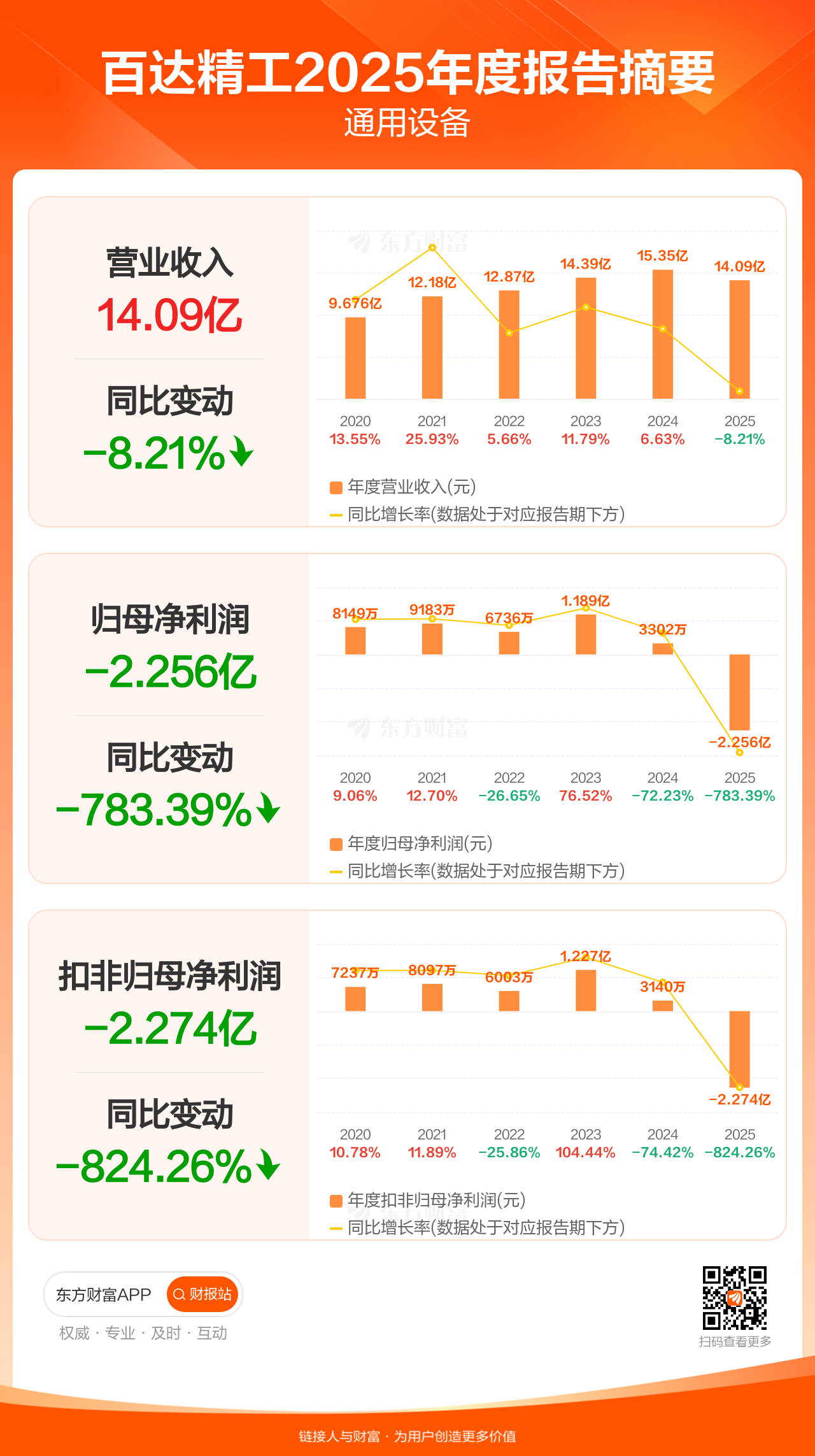 百达精工4月29日发布2025年年报显示,公司全年实现营业收入14.09亿元,同比下滑8.21%;归母净利润-2.26亿元;扣非归母净利润-2.27亿元。