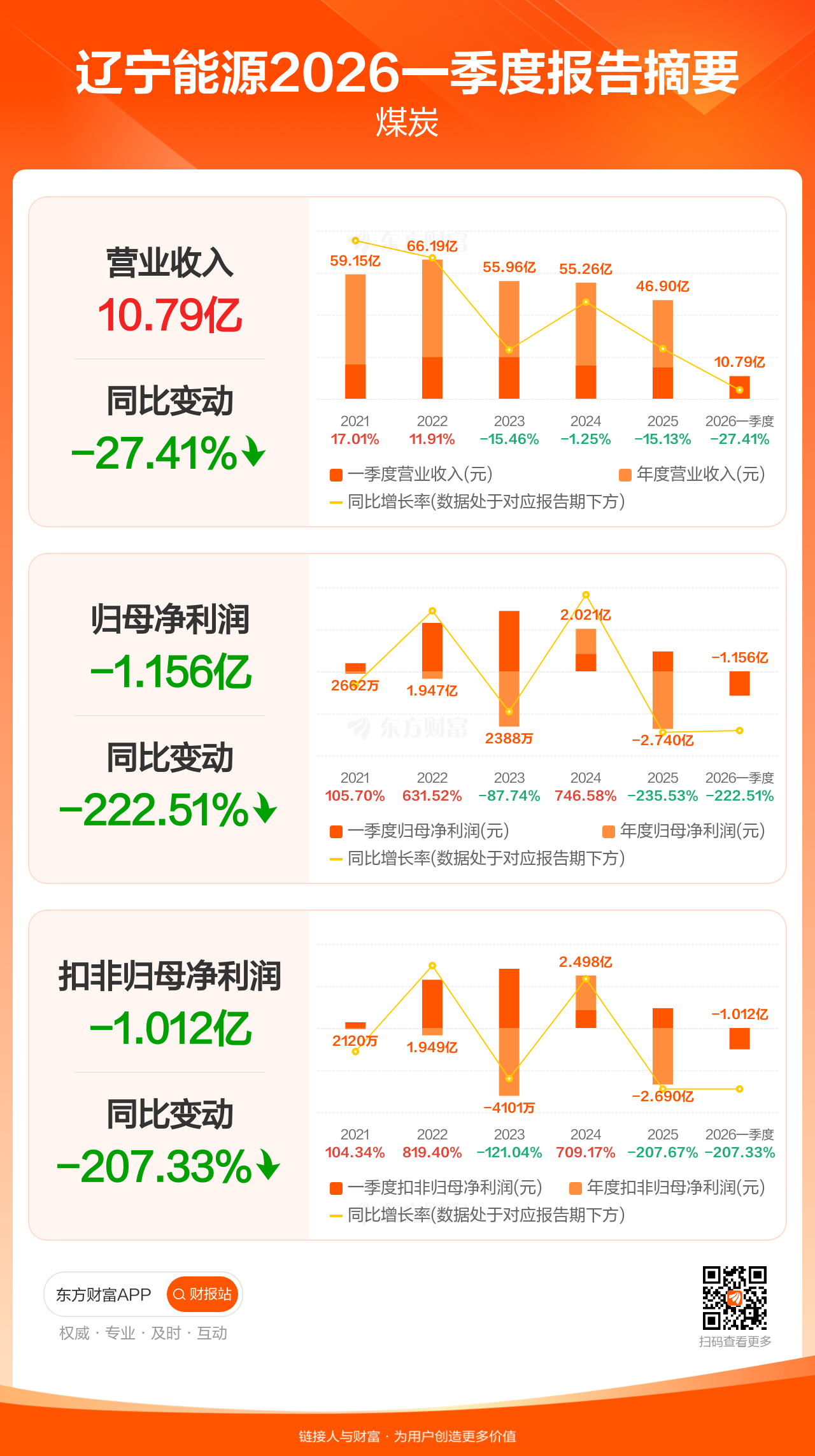 辽宁能源4月29日发布2026年一季报显示,公司一季度实现营业收入10.79亿元,同比下滑27.41%;归母净利润-1.16亿元;扣非归母净利润-1.01亿元。
