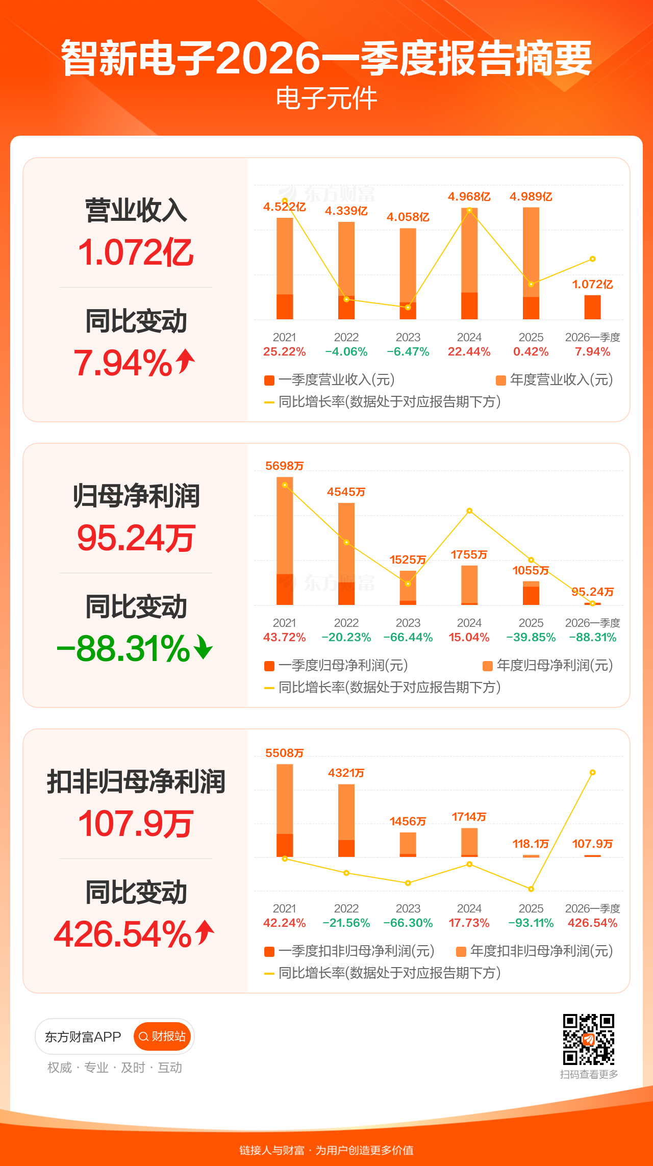 智新电子4月28日发布2026年一季报显示,公司一季度实现营业收入1.07亿元,同比增长7.94%;归母净利润95.24万元,同比下滑88.31%;扣非归母净利润107.86万元,同比增长426.54%。