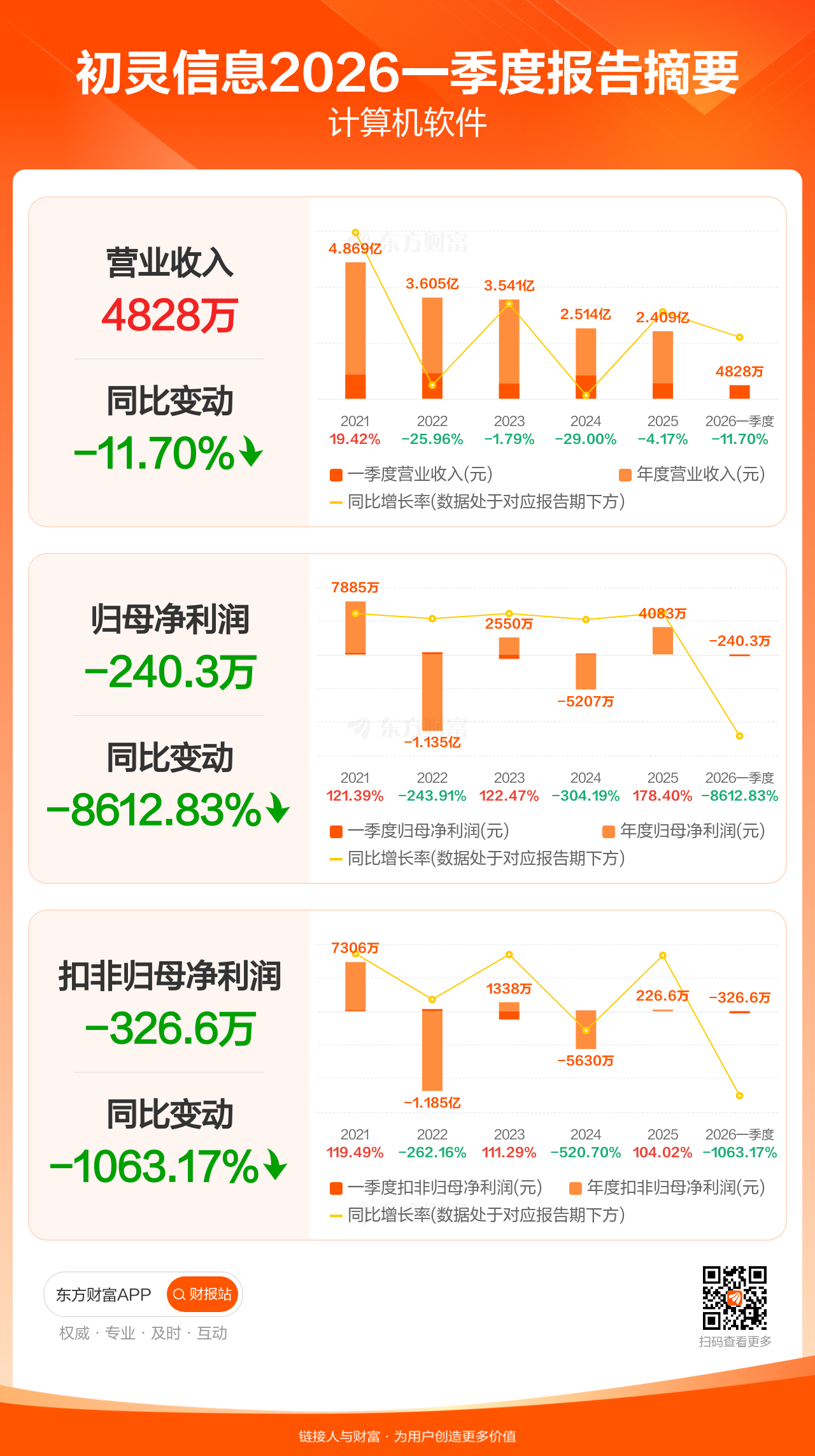 初灵信息4月29日发布2026年一季报显示,公司一季度实现营业收入4828.25万元,同比下滑11.70%;归母净利润-240.25万元;扣非归母净利润-326.59万元。