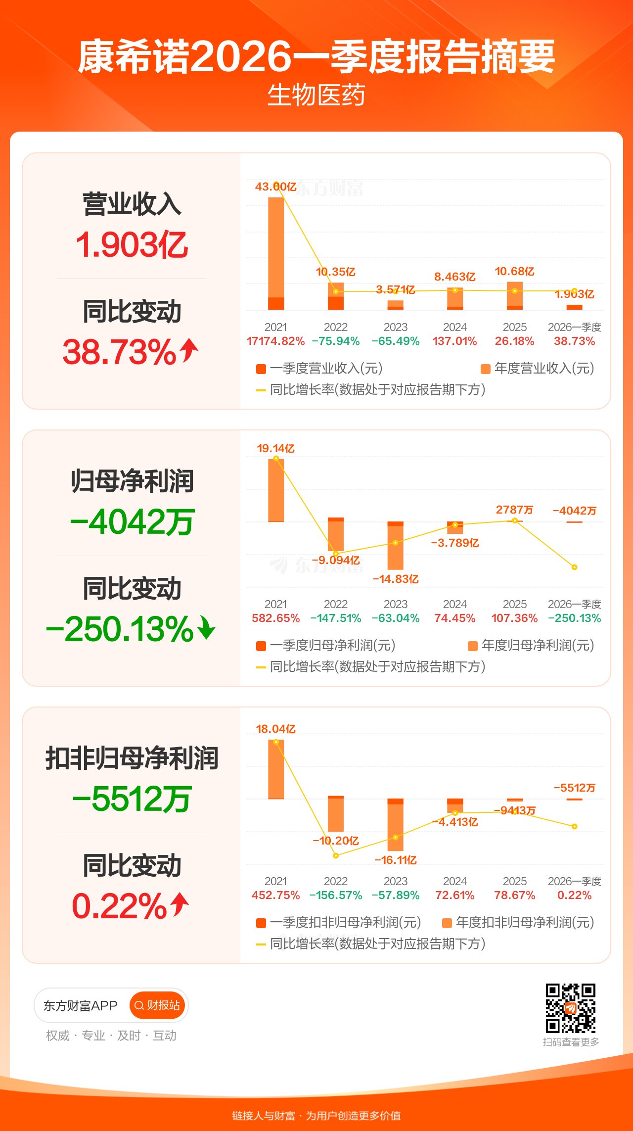 康希诺4月29日发布2026年一季报显示,公司一季度实现营业收入1.90亿元,同比增长38.73%;归母净利润-4042.43万元;扣非归母净利润-5511.52万元。