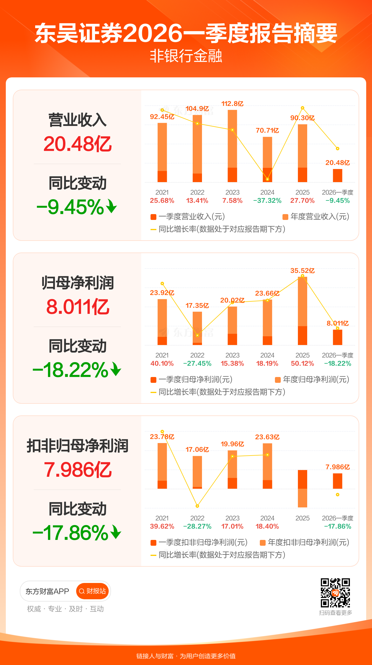 东吴证券4月29日发布2026年一季报显示,公司一季度实现营业收入20.48亿元,同比下滑9.45%;归母净利润8.01亿元,同比下滑18.22%;扣非归母净利润7.99亿元,同比下滑17.86%。