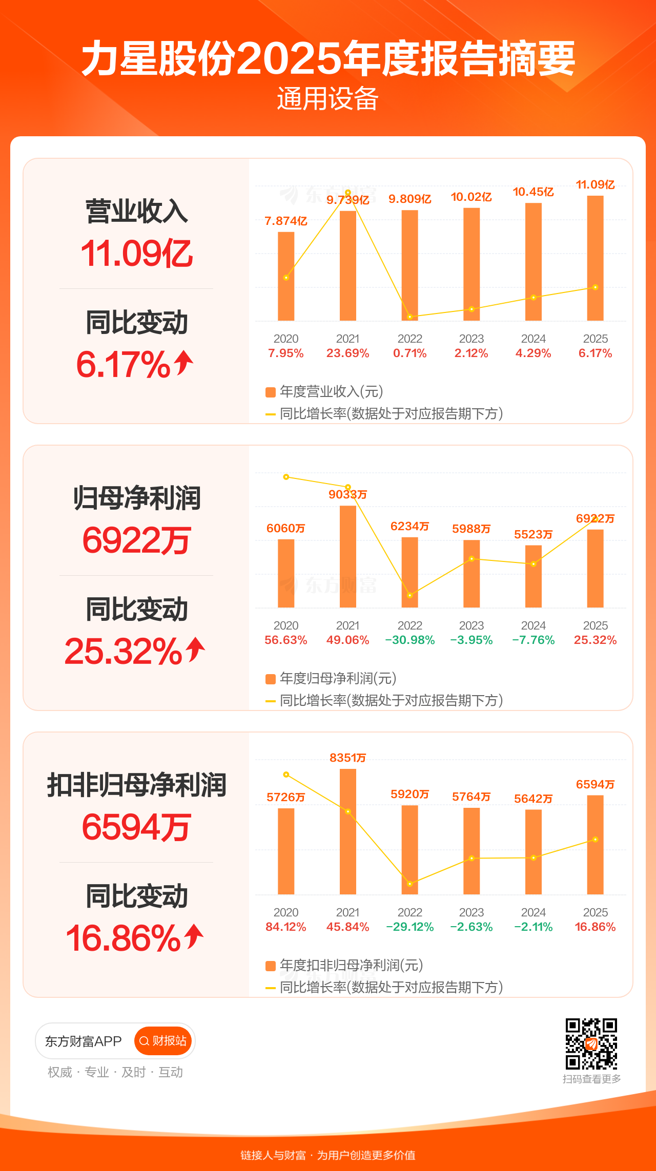 力星股份4月29日发布2025年年报显示,公司全年实现营业收入11.09亿元,同比增长6.17%;归母净利润6921.67万元,同比增长25.32%;扣非归母净利润6593.78万元,同比增长16.86%。