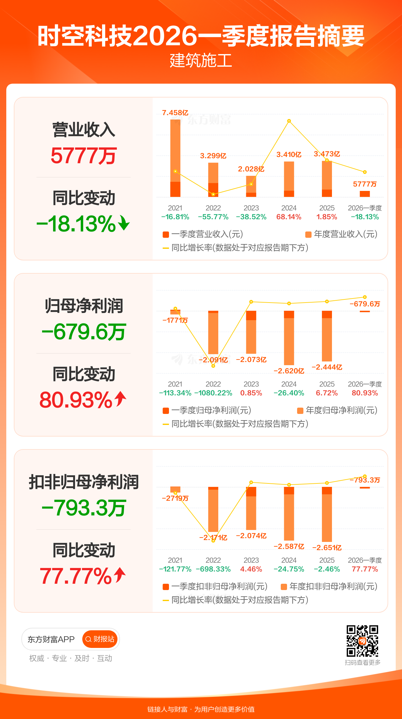 时空科技4月29日发布2026年一季报显示,公司一季度实现营业收入5777.27万元,同比下滑18.13%;归母净利润-679.56万元;扣非归母净利润-793.28万元。
