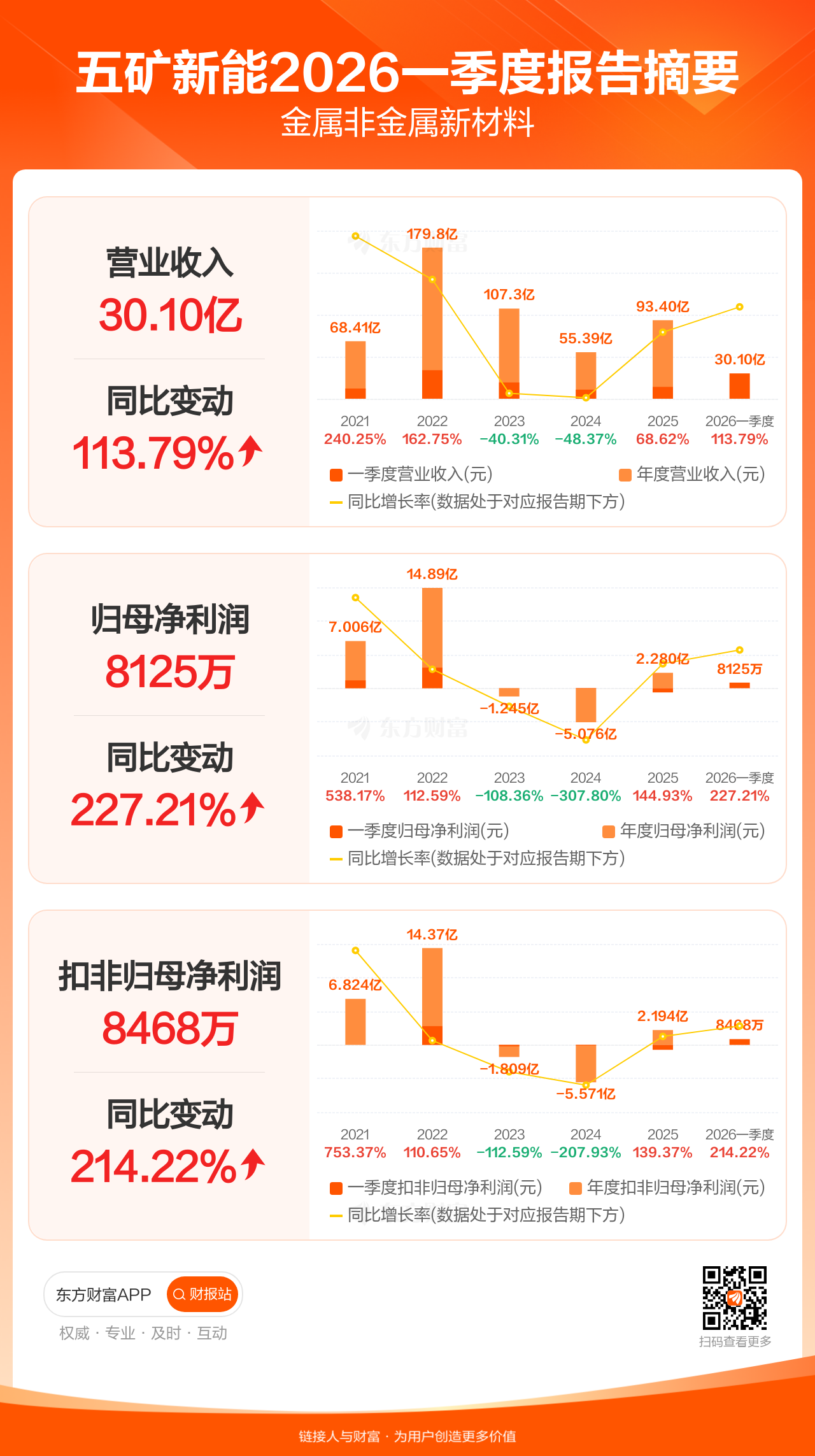 五矿新能4月29日发布2026年一季报显示,公司一季度实现营业收入30.10亿元,同比增长113.79%;归母净利润8124.95万元,同比增长227.21%;扣非归母净利润8468.40万元,同比增长214.22%。