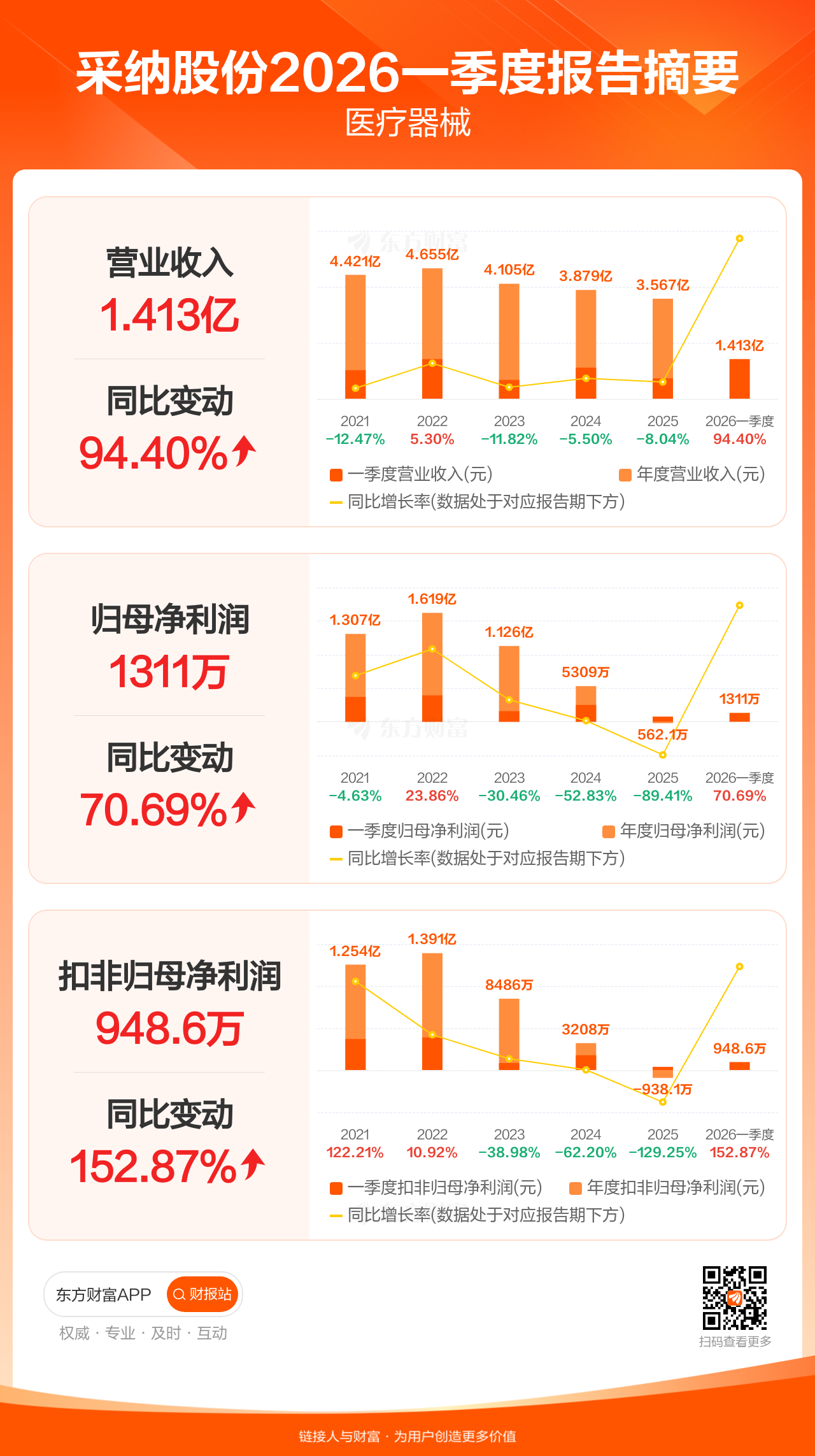 采纳股份4月29日发布2026年一季报显示,公司一季度实现营业收入1.41亿元,同比增长94.40%;归母净利润1310.93万元,同比增长70.69%;扣非归母净利润948.63万元,同比增长152.87%。