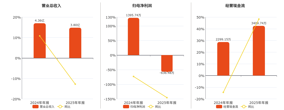 公司营业总收入为3.80亿元,在已披露的同业公司中排名第151,较去年同报告期营业总收入减少5570.16万元,同比较去年同期下降12.77%。归母净利润为-636.48万元,在已披露的同业公司中排名第127,较去年同报告期归母净利润减少2032.22万元,同比较去年同期下降145.60%。经营活动现金净流入为3409.74万元,在已披露的同业公司中排名第117。