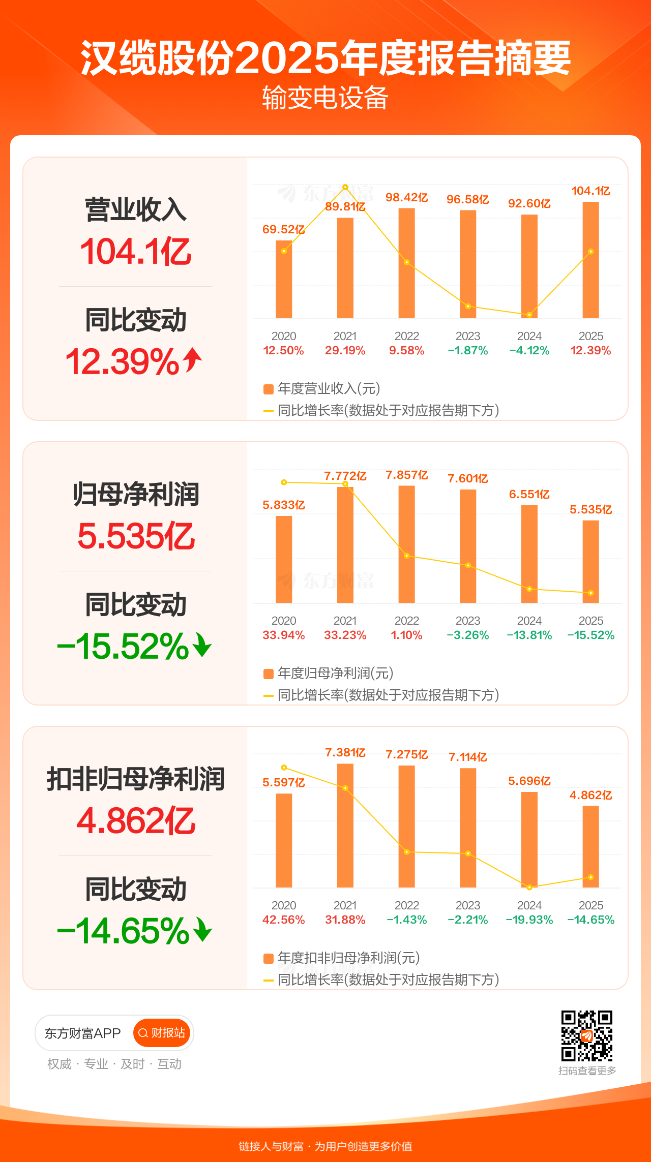 汉缆股份4月29日发布2025年年报显示,公司全年实现营业收入104.07亿元,同比增长12.39%;归母净利润5.53亿元,同比下滑15.52%;扣非归母净利润4.86亿元,同比下滑14.65%。