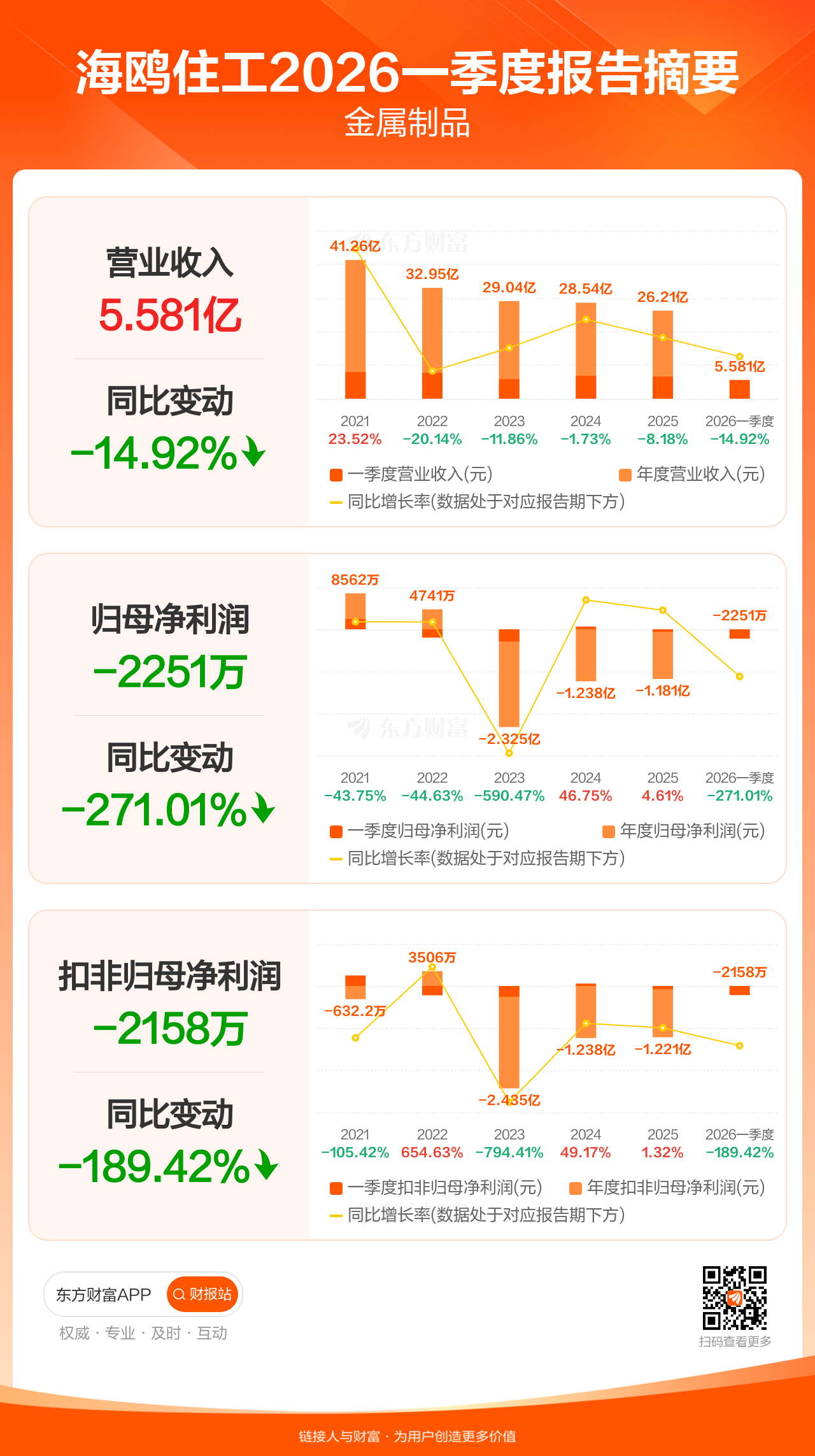 海鸥住工4月29日发布2026年一季报显示,公司一季度实现营业收入5.58亿元,同比下滑14.92%;归母净利润-2250.94万元;扣非归母净利润-2157.83万元。