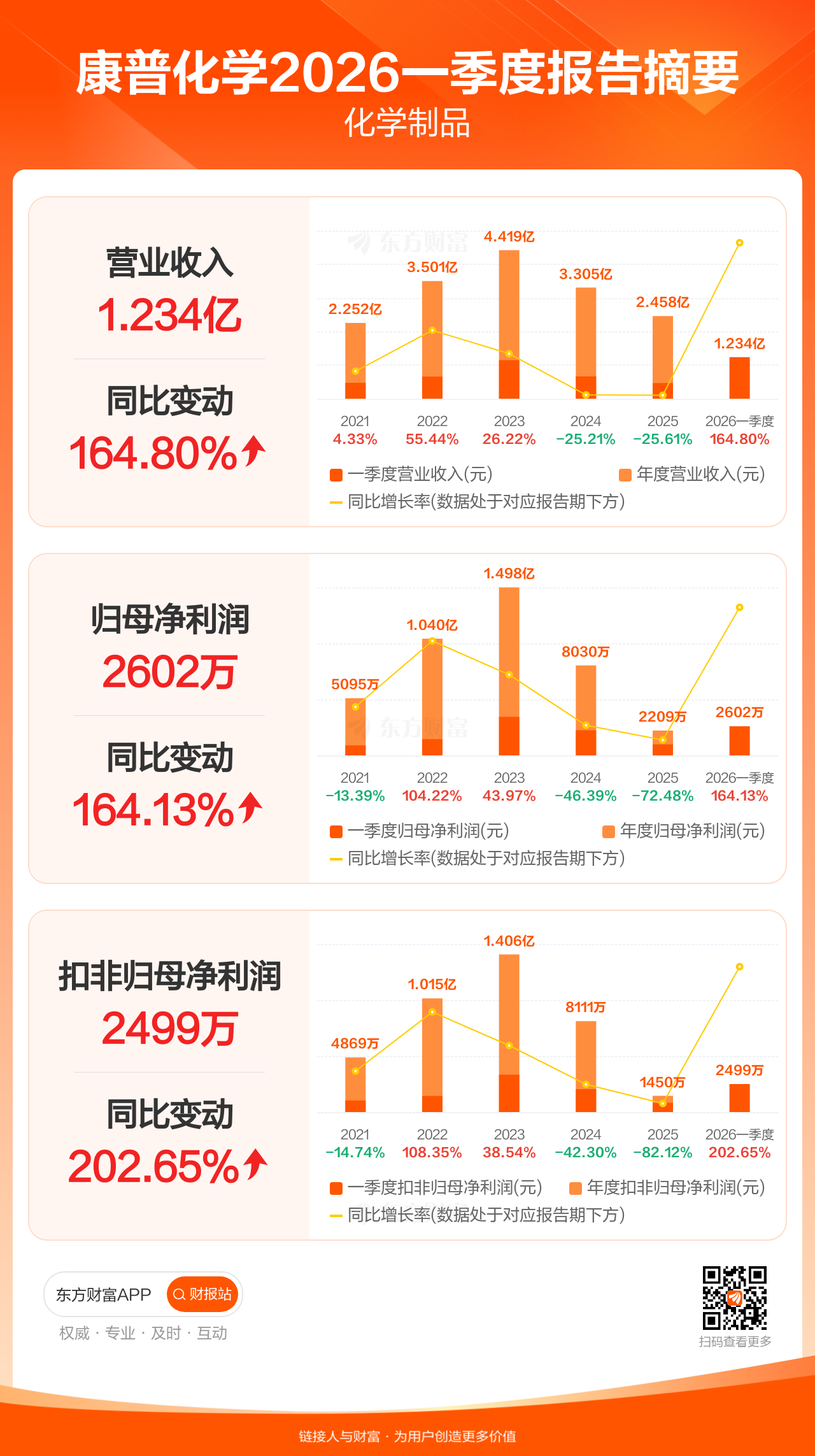 康普化学4月28日发布2026年一季报显示,公司一季度实现营业收入1.23亿元,同比增长164.80%;归母净利润2601.64万元,同比增长164.13%;扣非归母净利润2499.10万元,同比增长202.65%。