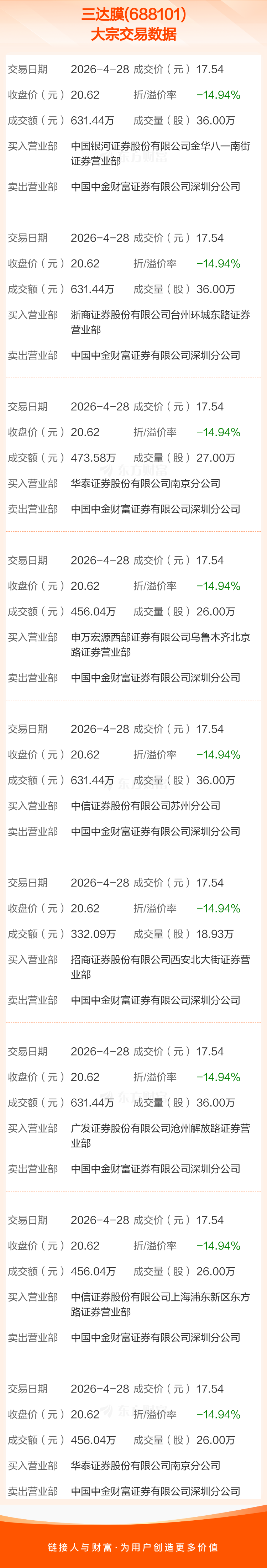 大宗交易:三达膜成交4699.55万元,折价14.94%(4-28)