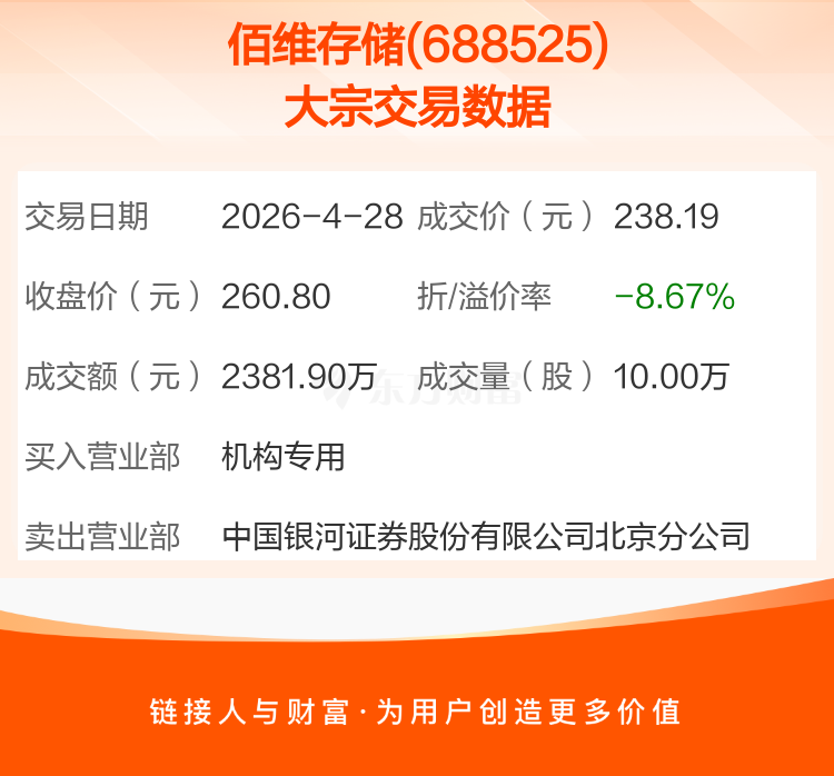 2026年4月28日,佰维存储发生1笔大宗交易,共成交10.00万股,成交金额2381.90万元,占其流通市值比例为0.02%。