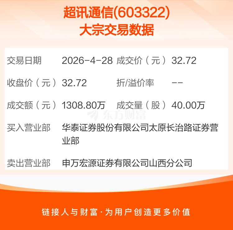2026年4月28日,超讯通信发生1笔大宗交易,共成交40.00万股,成交金额1308.80万元,占其流通市值比例为0.25%。
