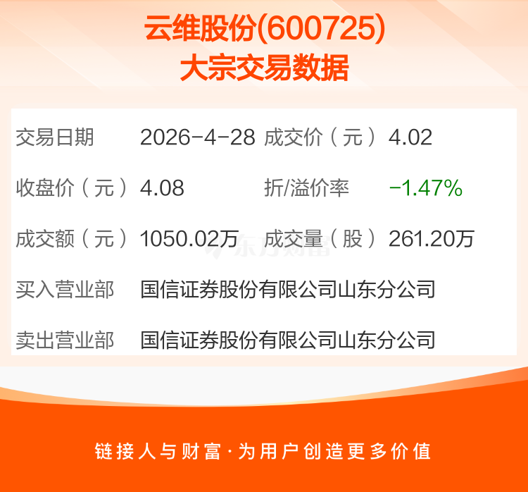 2026年4月28日,云维股份发生1笔大宗交易,共成交261.20万股,成交金额1050.02万元,占其流通市值比例为0.21%。
