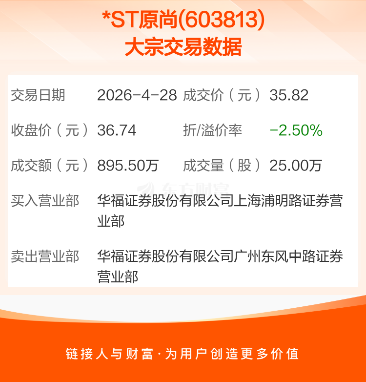 2026年4月28日,*ST原尚发生1笔大宗交易,共成交25.00万股,成交金额895.50万元,占其流通市值比例为0.23%。