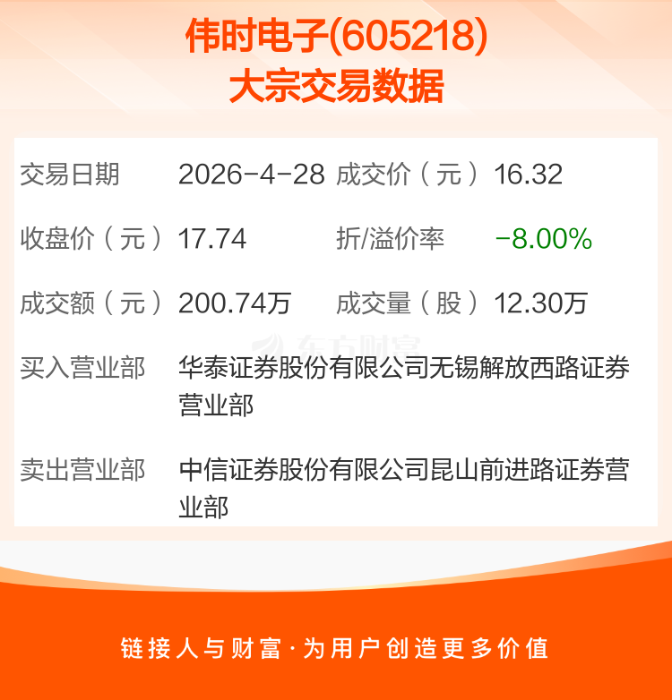 大宗交易:伟时电子成交200.74万元,折价8.00%(4-28)