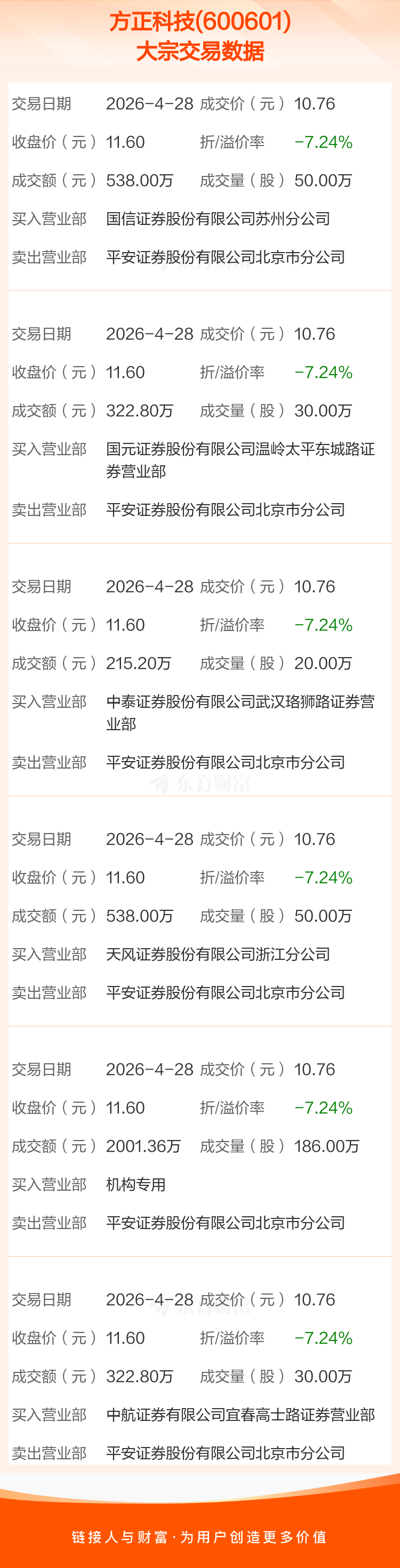 2026年4月28日,方正科技发生6笔大宗交易,共成交366.00万股,成交金额3938.16万元,占其流通市值比例为0.08%。
