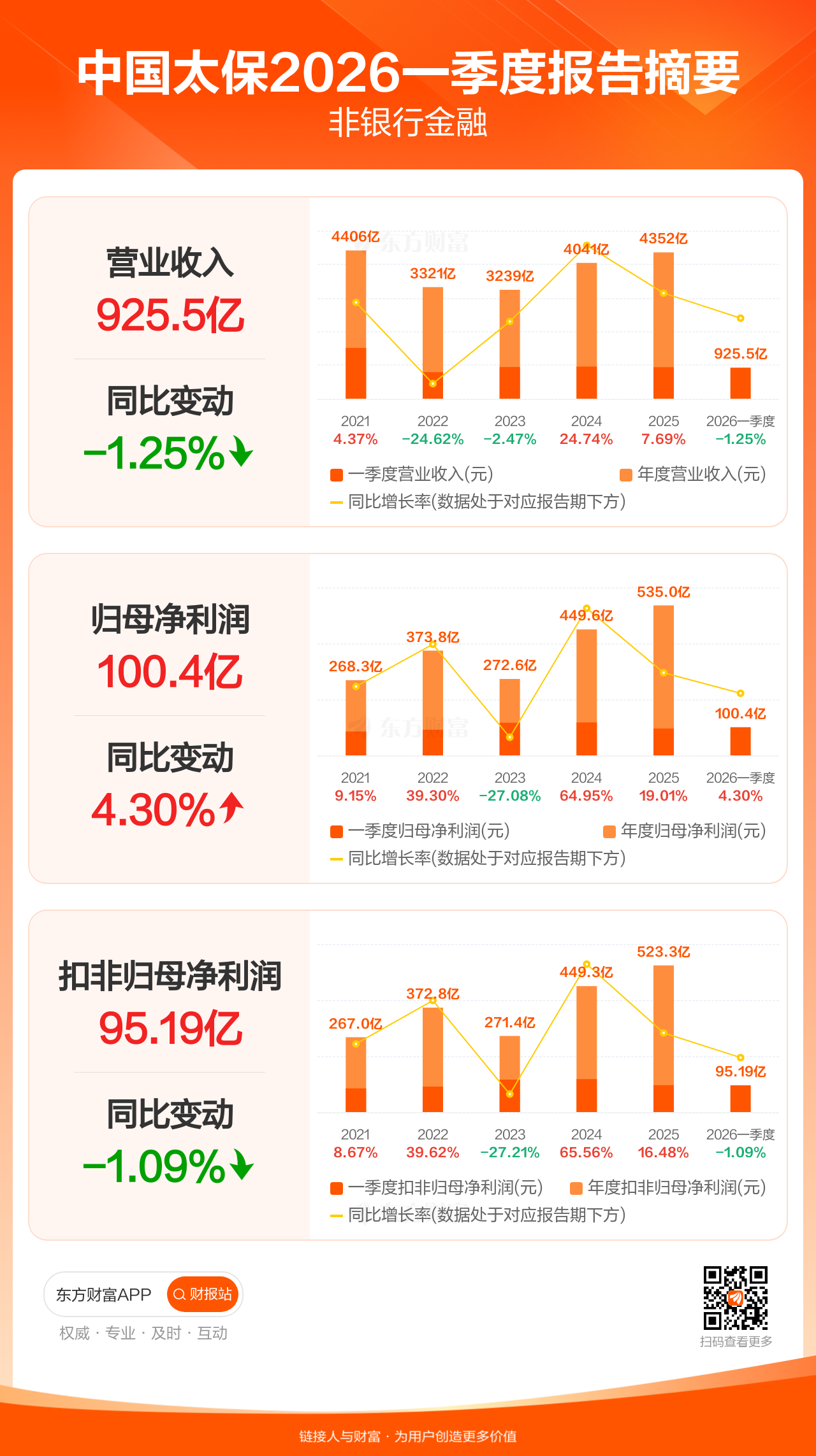 中国太保4月29日发布2026年一季报显示,公司一季度实现营业收入925.47亿元,同比下滑1.25%;归母净利润100.41亿元,同比增长4.30%;扣非归母净利润95.19亿元,同比下滑1.09%。