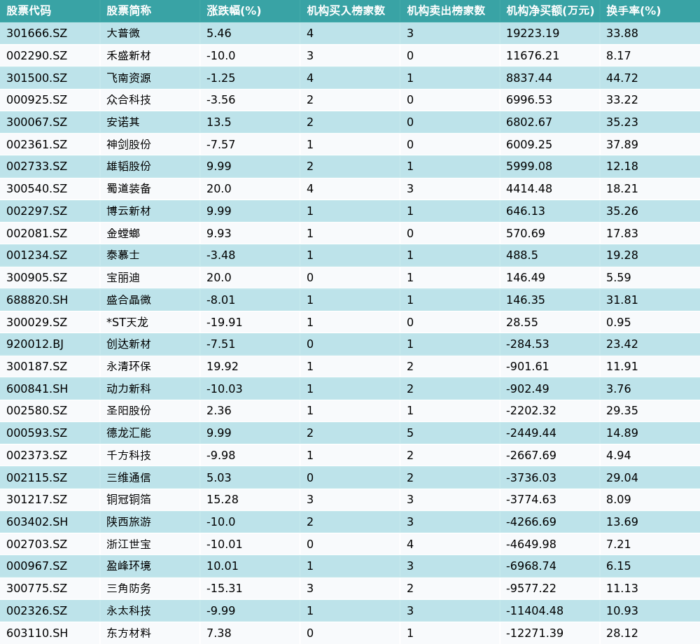 南财智讯4月28日电,盘后数据显示,因当日异动登上龙虎榜的个股中,28只沪深A股龙虎榜出现了机构的身影,机构合计净买入5928.32万元,具体来看,机构净买入14只个股,净卖出14只个股。其中,机构净买入前三分别为大普微(301666.SZ)、禾盛新材(002290.SZ)与飞南资源(301500.SZ),详情见下图:机构净卖出的个股中,前三分别为东方材料(603110.SH)、永太科技(002326.SZ)与三角防务(300775.SZ)。