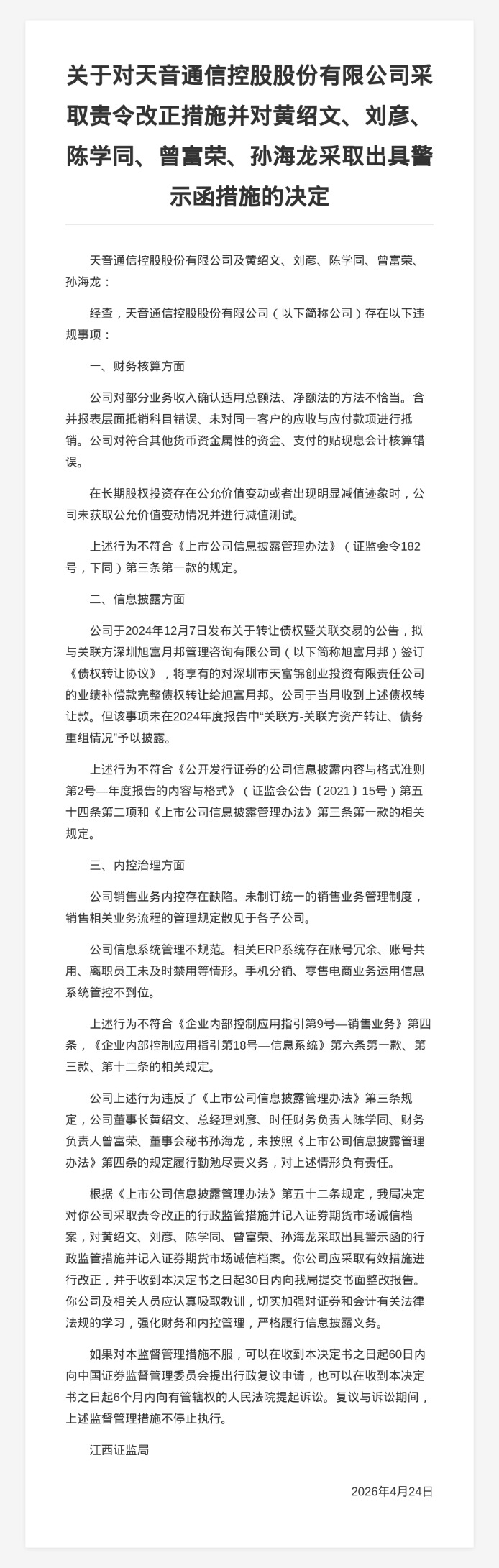 对此,江西证监局决定对天音通信控股股份有限公司采取责令改正的行政监管措施,并记入证券期货市场诚信档案;对黄绍文、刘彦、陈学同、曾富荣、孙海龙采取出具警示函的行政监管措施,并记入证券期货市场诚信档案。