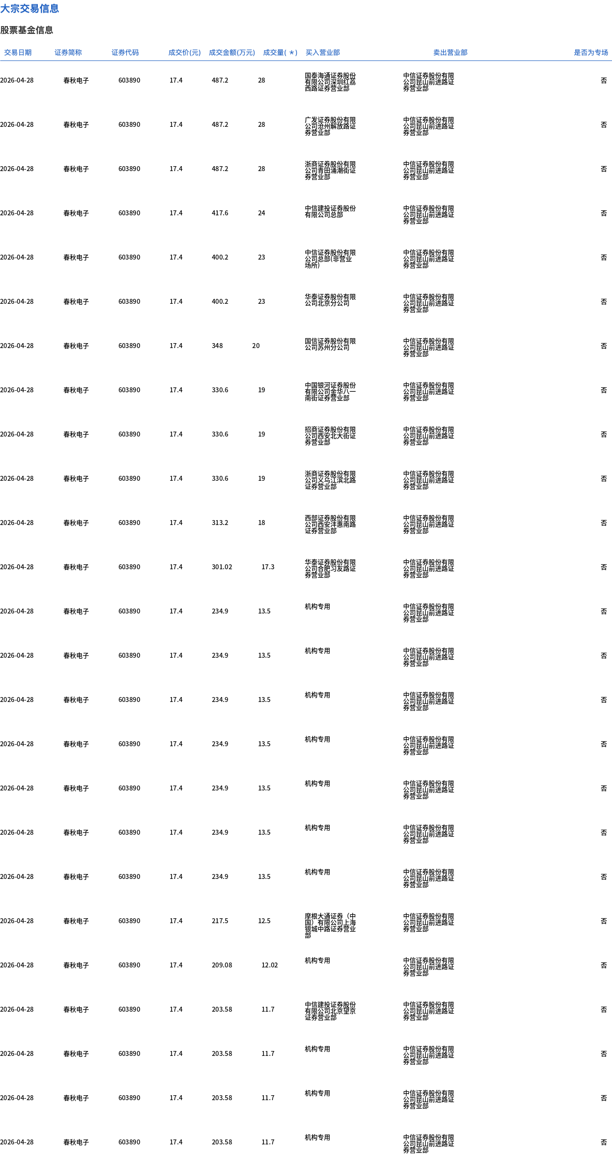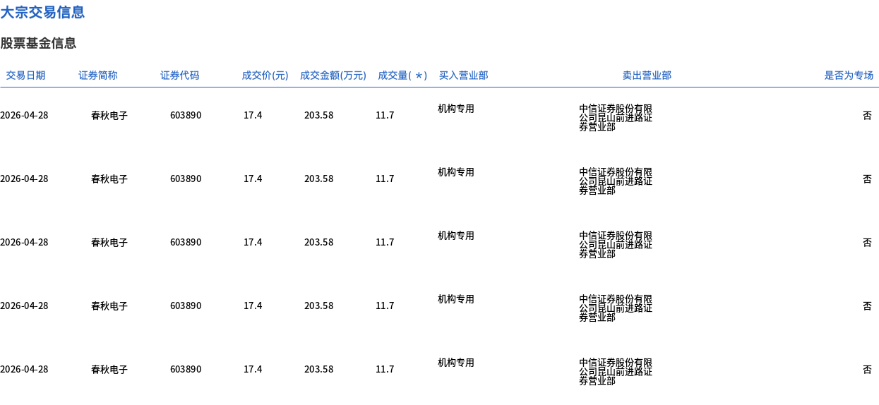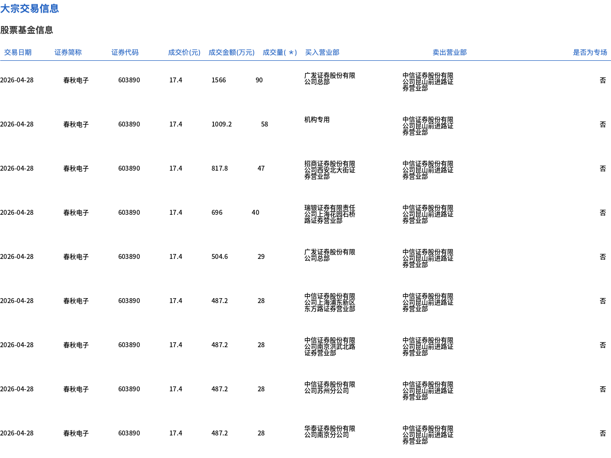 春秋电子今日大宗交易折价成交866.62万股,成交额1.51亿元