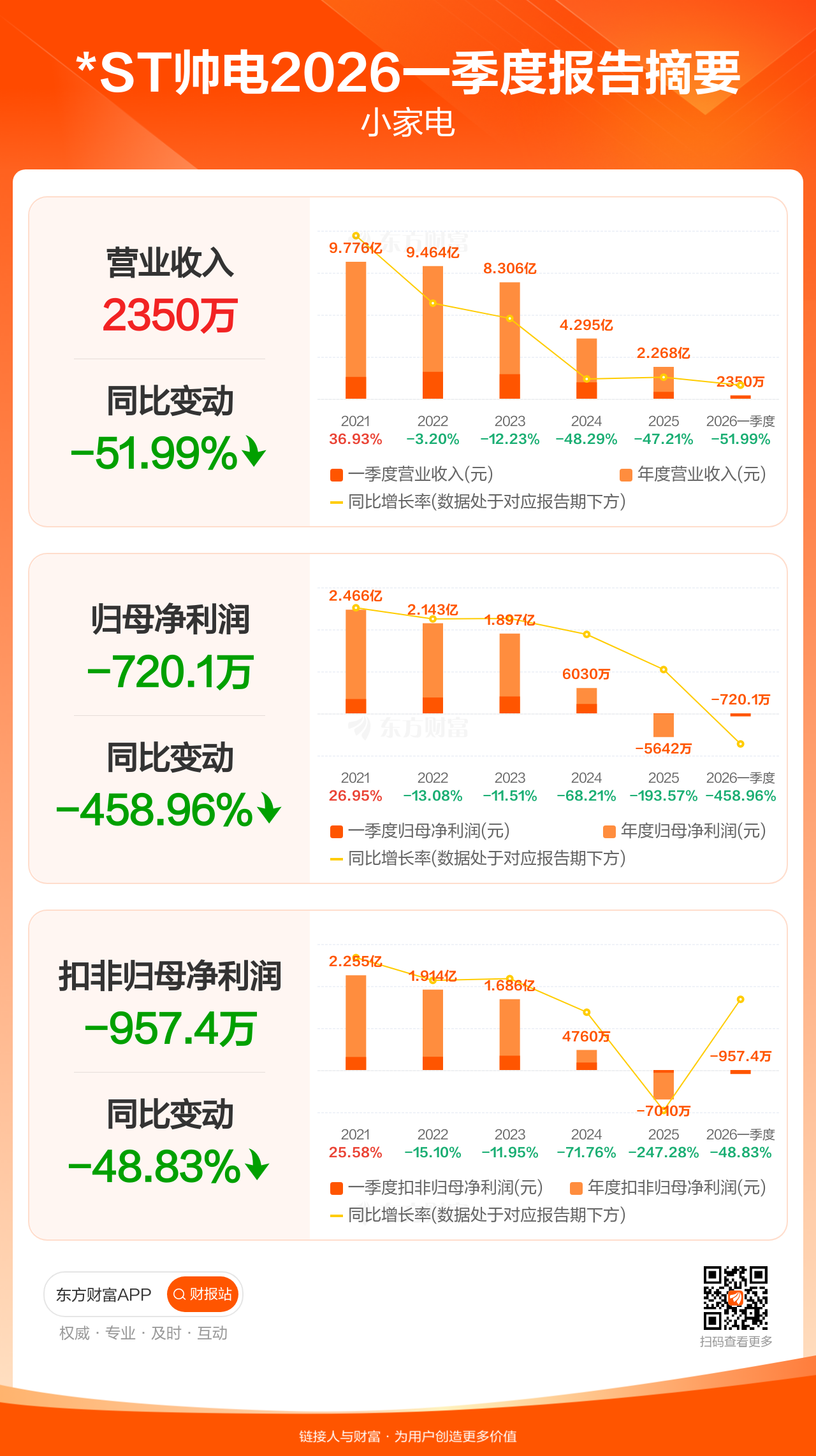 *ST帅电4月29日发布2026年一季报显示,公司一季度实现营业收入2349.88万元,同比下滑51.99%;归母净利润-720.14万元;扣非归母净利润-957.40万元。