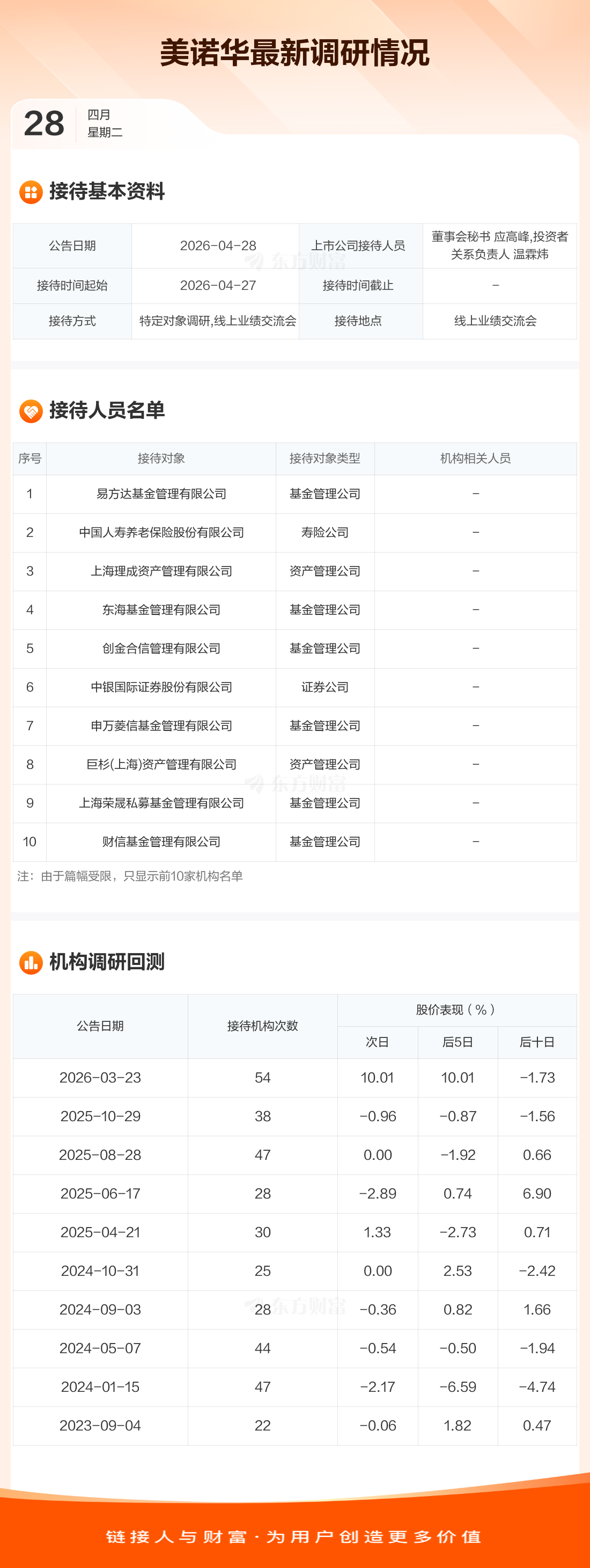 美诺华4月28日公告称,4月27日接待易方达基金管理有限公司等39家机构调研。接待人员包括董事会秘书 应高峰,投资者关系负责人 温霖炜。