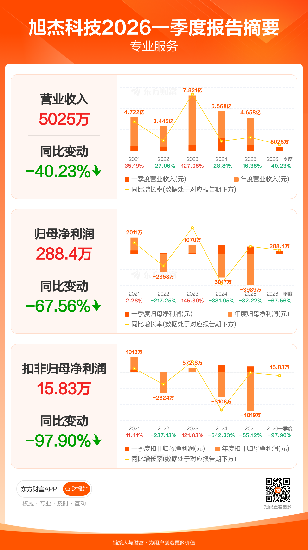 旭杰科技4月28日发布2026年一季报显示,公司一季度实现营业收入5024.98万元,同比下滑40.23%;归母净利润288.38万元,同比下滑67.56%;扣非归母净利润15.83万元,同比下滑97.90%。