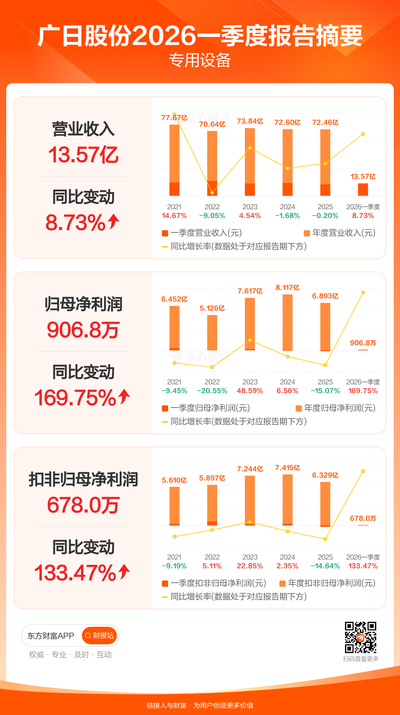 广日股份4月29日发布2026年一季报显示,公司一季度实现营业收入13.57亿元,同比增长8.73%;归母净利润906.82万元,同比增长169.75%;扣非归母净利润678.00万元,同比增长133.47%。