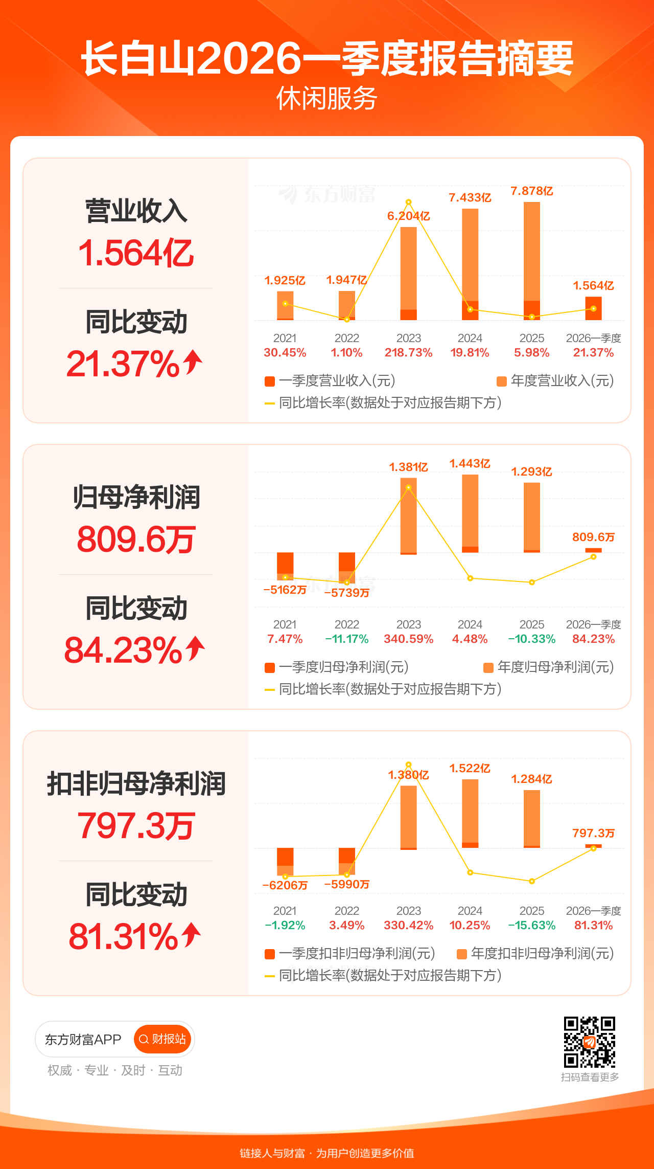 长白山4月29日发布2026年一季报显示,公司一季度实现营业收入1.56亿元,同比增长21.37%;归母净利润809.64万元,同比增长84.23%;扣非归母净利润797.32万元,同比增长81.31%。