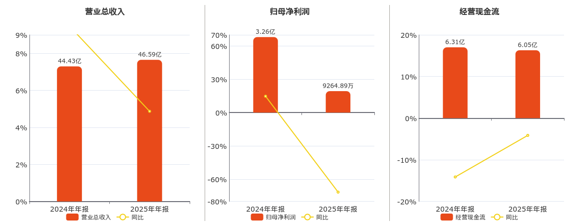 公司营业总收入为46.59亿元。归母净利润为9264.89万元,较去年同报告期归母净利润减少2.34亿元,同比较去年同期下降71.61%。经营活动现金净流入为6.05亿元,较去年同报告期经营活动现金净流入减少2614.43万元,同比较去年同期下降4.14%。