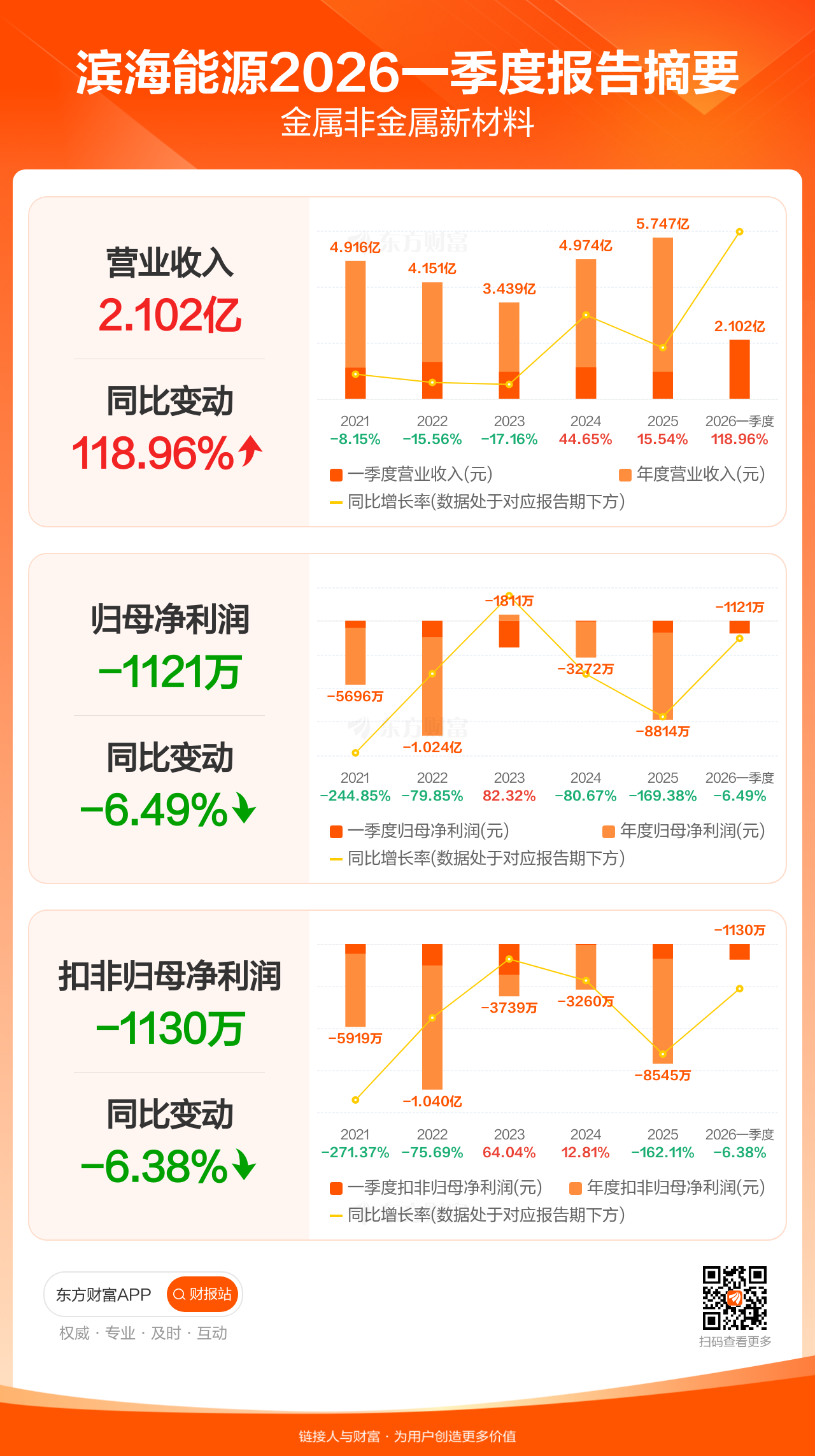 滨海能源4月29日发布2026年一季报显示,公司一季度实现营业收入2.10亿元,同比增长118.96%;归母净利润-1121.10万元;扣非归母净利润-1130.25万元。