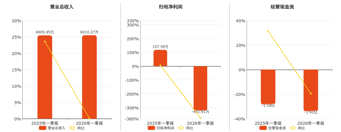 公司营业总收入为6010.27万元,较去年同报告期营业总收入增加4.32万元,实现5年连续上涨,同比较去年同期上涨0.07%。归母净利润为-431.91万元。经营活动现金净流入为-1.41亿元。