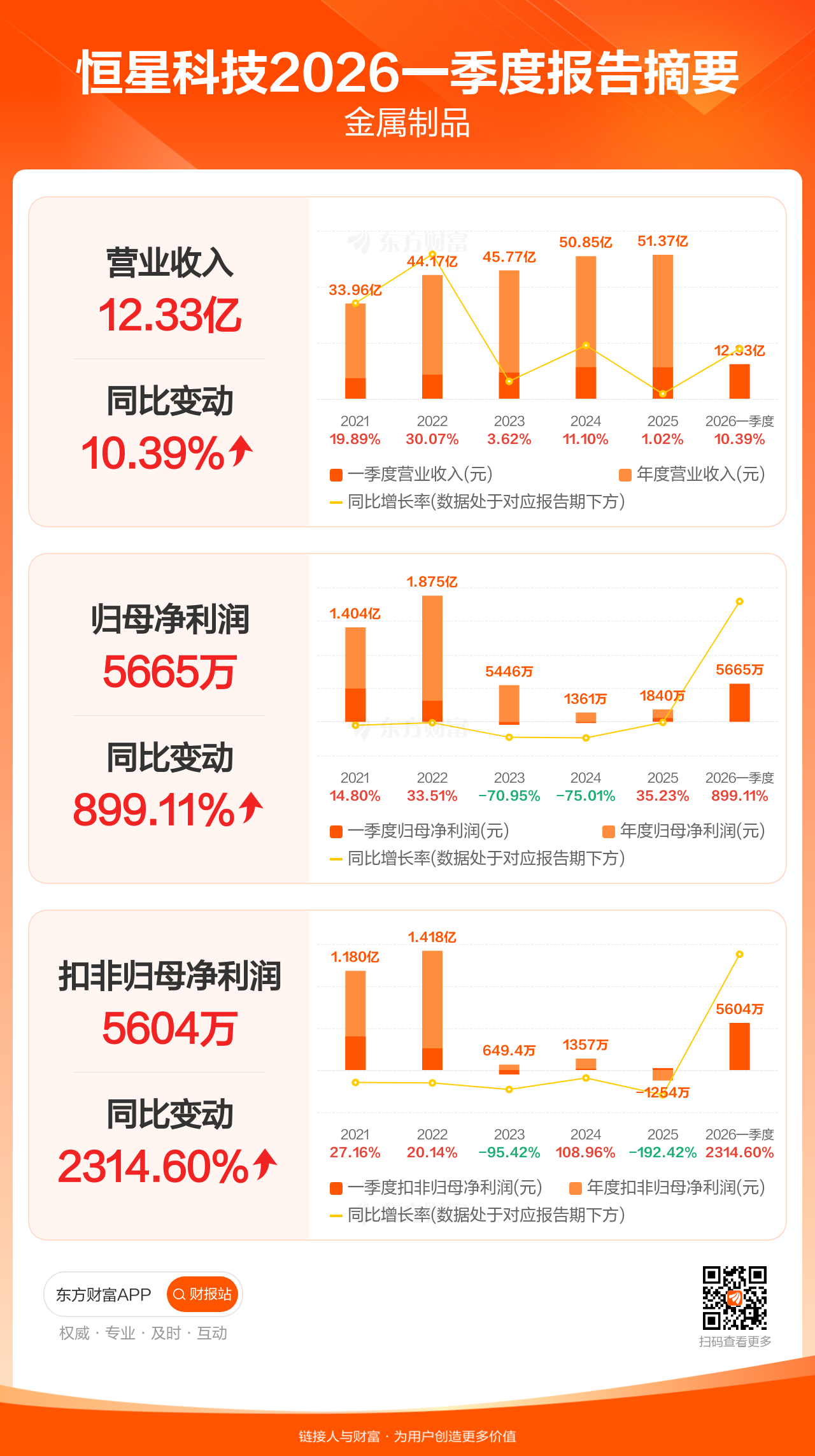 恒星科技4月29日发布2026年一季报显示,公司一季度实现营业收入12.33亿元,同比增长10.39%;归母净利润5664.93万元,同比增长899.11%;扣非归母净利润5603.54万元,同比增长2314.60%。