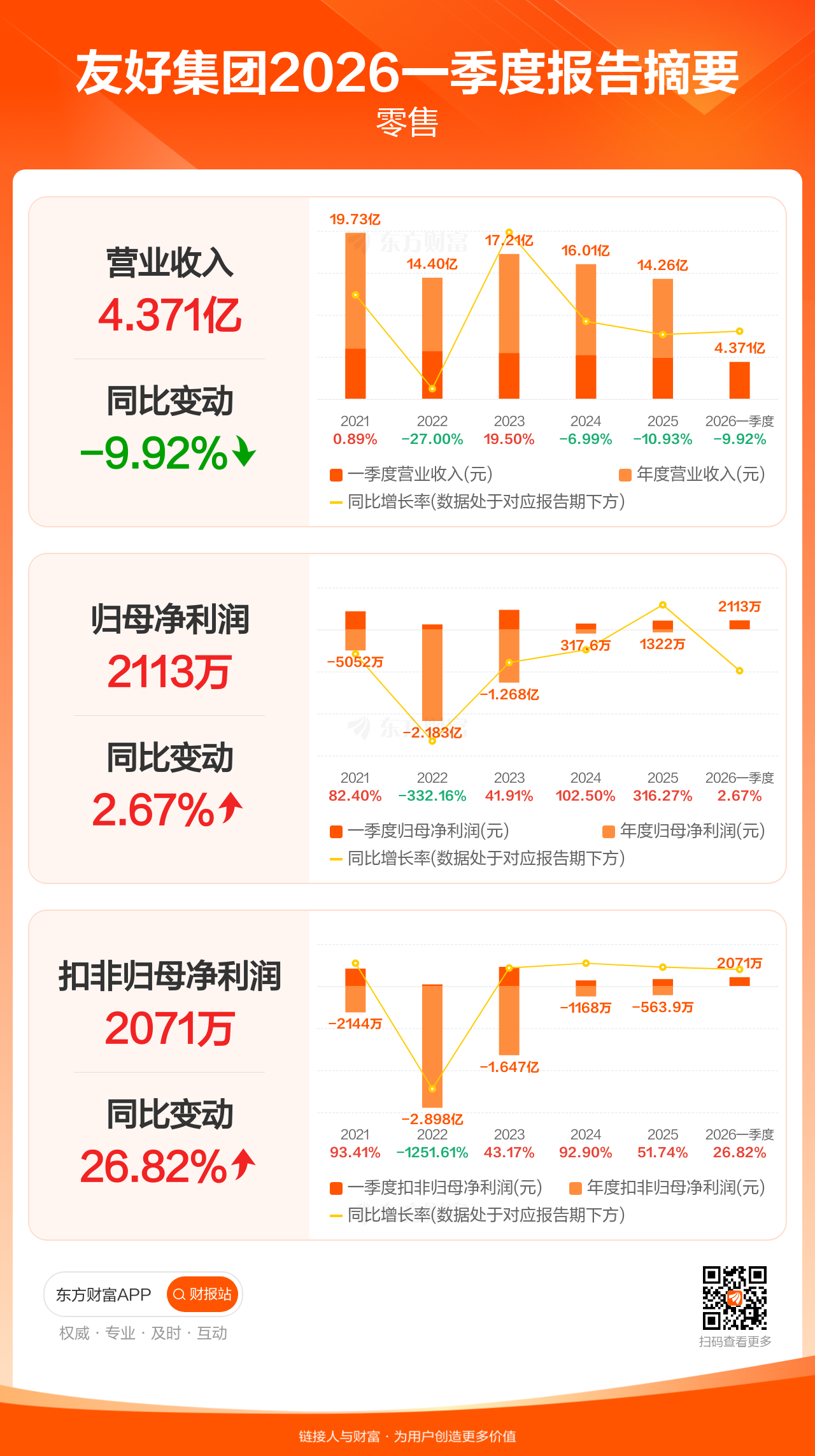 图解财报:友好集团一季度归母净利润2113.20万元,同比增长2.67%