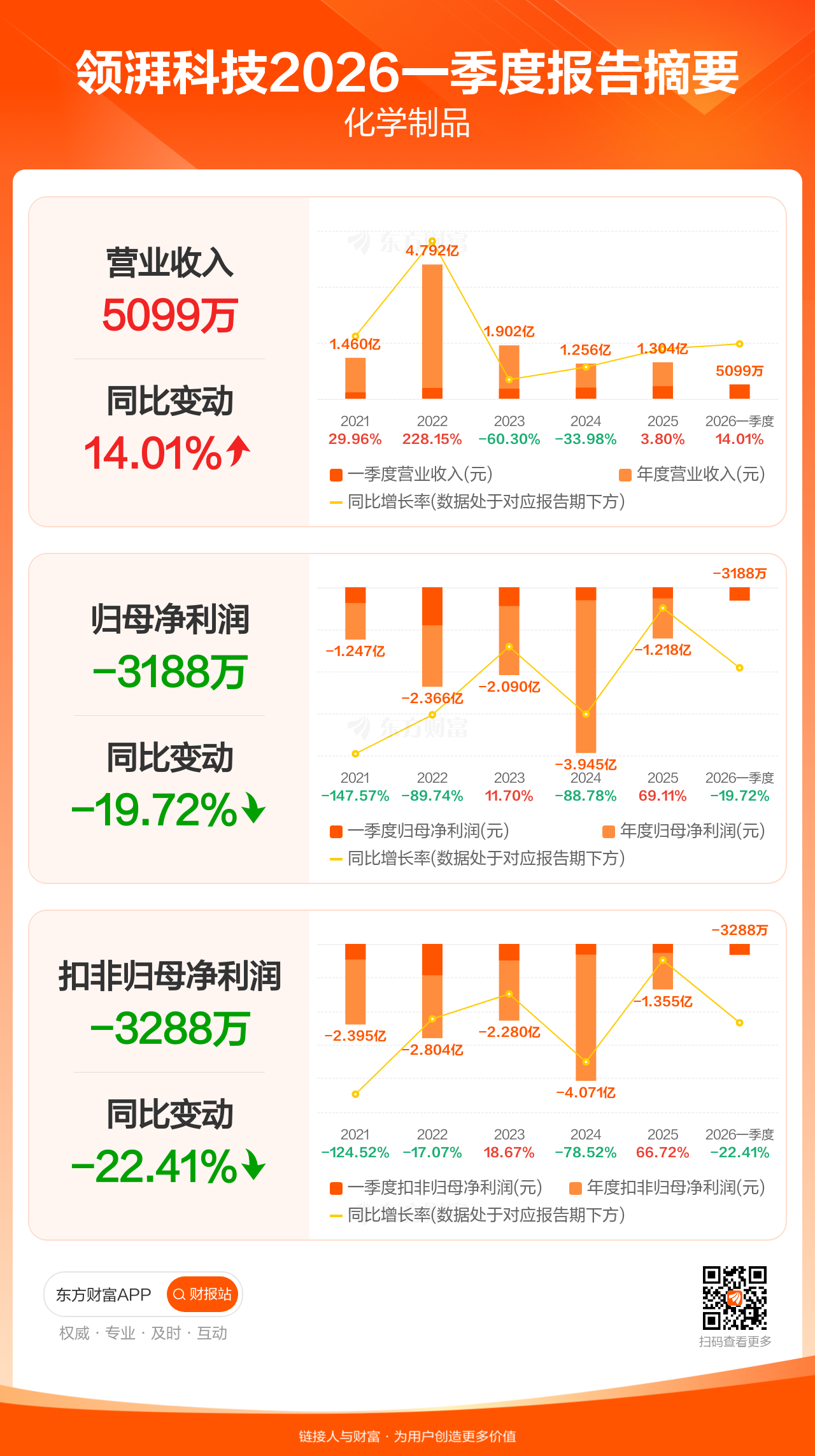 领湃科技4月29日发布2026年一季报显示,公司一季度实现营业收入5098.79万元,同比增长14.01%;归母净利润-3188.40万元;扣非归母净利润-3288.08万元。