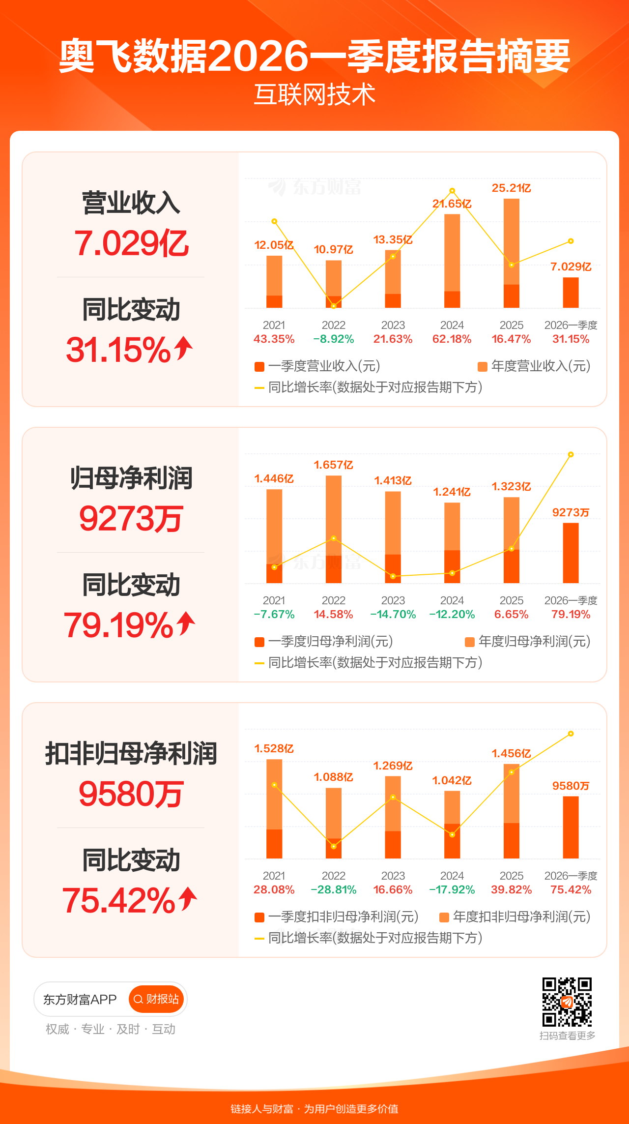 奥飞数据4月29日发布2026年一季报显示,公司一季度实现营业收入7.03亿元,同比增长31.15%;归母净利润9272.74万元,同比增长79.19%;扣非归母净利润9580.43万元,同比增长75.42%。