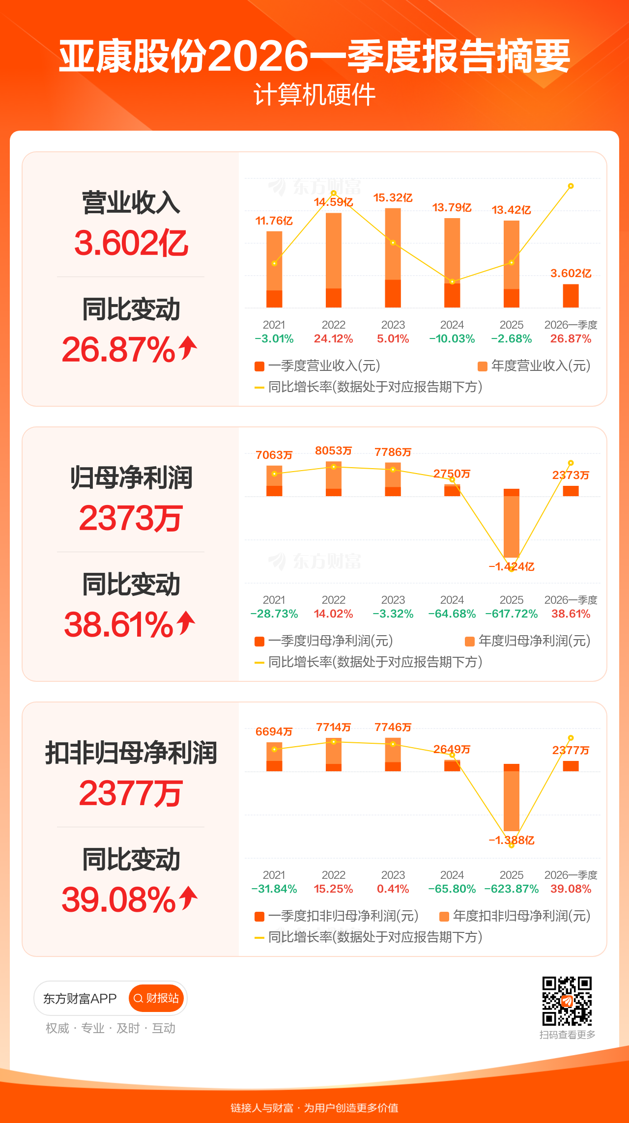 亚康股份4月29日发布2026年一季报显示,公司一季度实现营业收入3.60亿元,同比增长26.87%;归母净利润2372.65万元,同比增长38.61%;扣非归母净利润2376.68万元,同比增长39.08%。