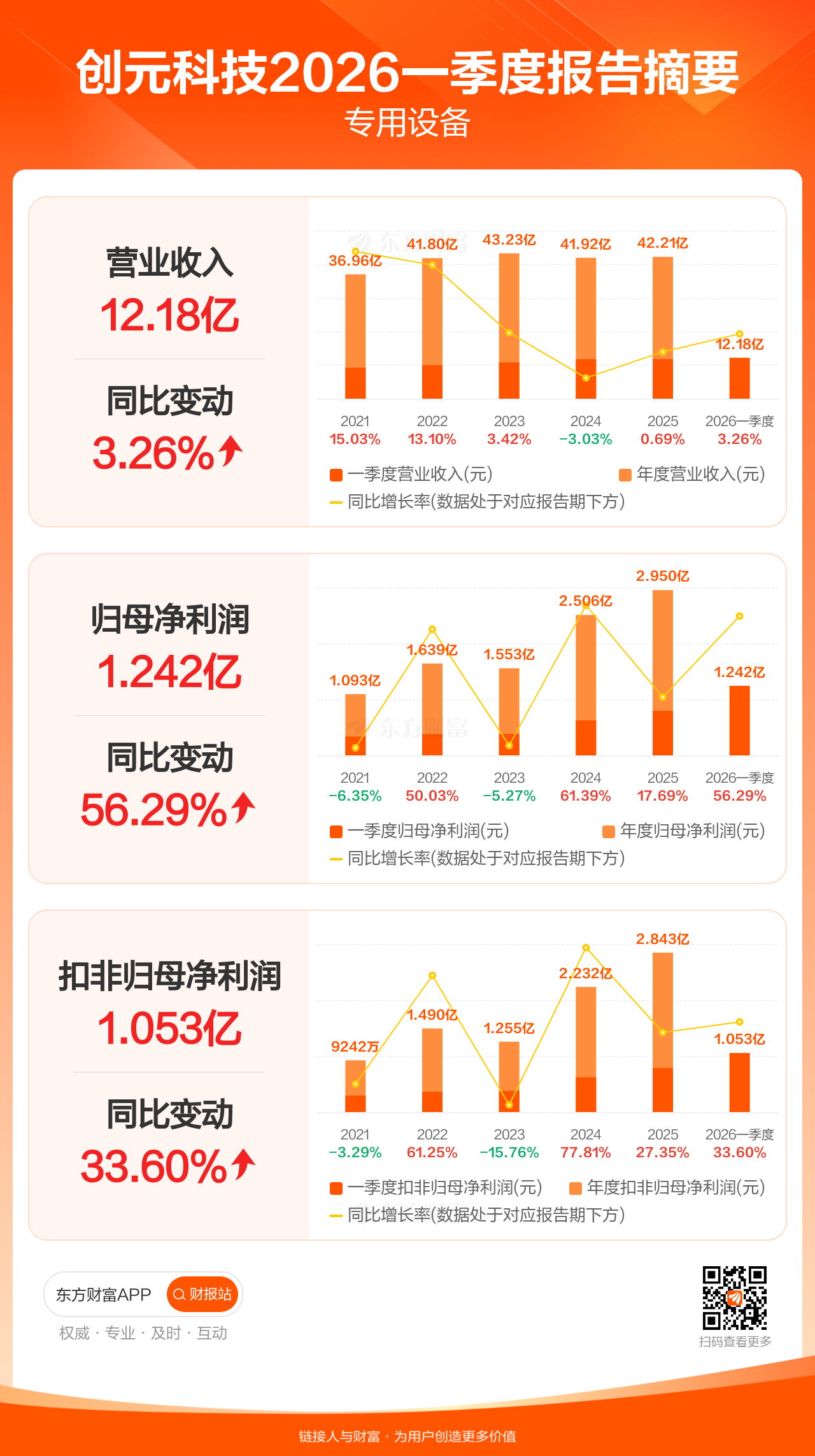 创元科技4月29日发布2026年一季报显示,公司一季度实现营业收入12.18亿元,同比增长3.26%;归母净利润1.24亿元,同比增长56.29%;扣非归母净利润1.05亿元,同比增长33.60%。